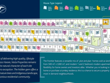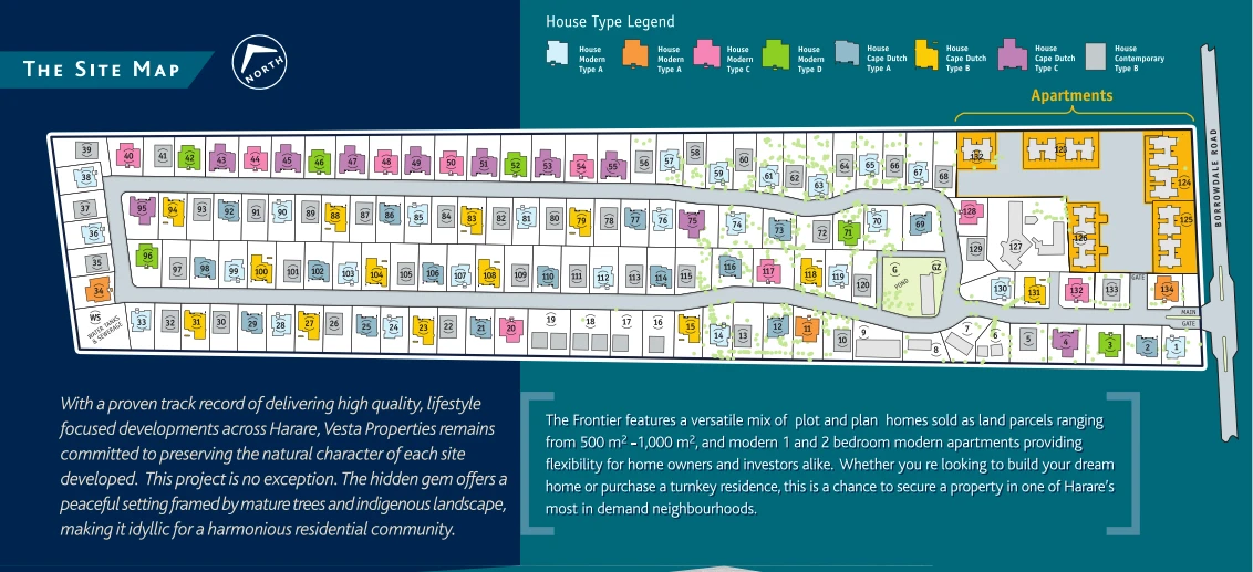 The Frontier combines residential stands (500 m2 to 750 m2) that have 8 optional plans available to self-build by the purchaser, as well as luxury 1 & 2 bedroom apartments that will be built by the developer, Vesta Properties.
