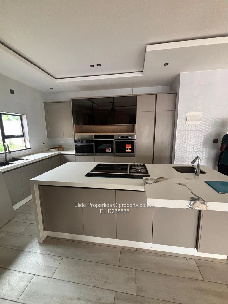 Large Fitted Kitchen with fitted double-door fridge, electric and gas stove, and microwave.