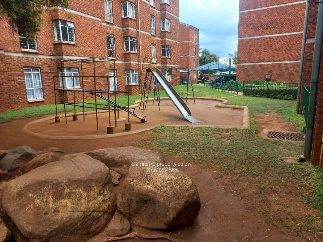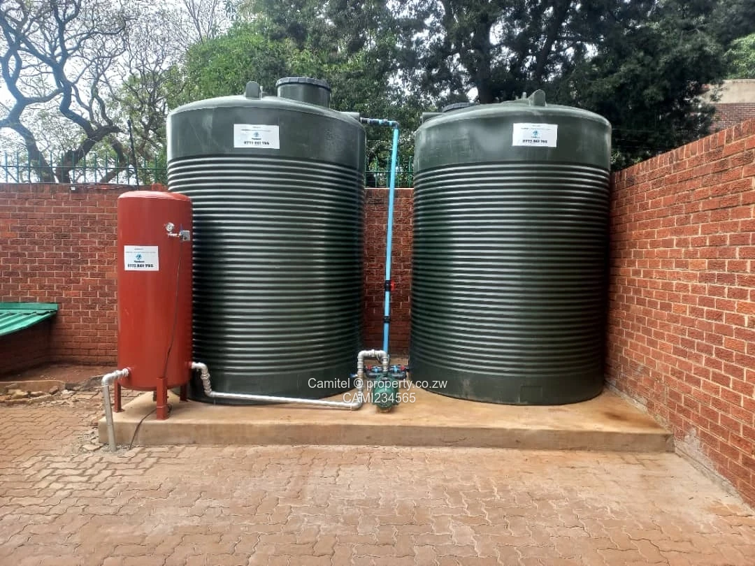 A major asset is the estate borehole — visible in the images as twin water tanks, pump and pressure vessel — ensuring reliable water supply for residents. Outdoor space includes a small landscaped courtyard with children’s play area (slide and swings visible), plus mature trees and rock features that give the grounds a pleasant, family-friendly feel. The entire property sits on a generous 4,000 m² parcel, providing ample communal space and privacy despite the CBD location.
