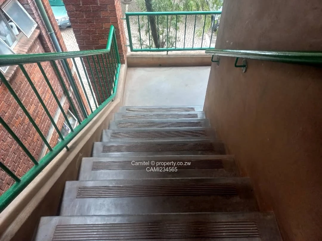 Spencer C, Avenues — Spacious 2-bedroom, 1-bath apartment (65 m²) available for rent in a secure red-brick complex in Harare CBD. As shown in the photos, the development sits behind a high brick wall with green steel railings and clear signage, offering peace of mind and character. The unit opens to a bright lounge with large window, comfortable seating and tiled floors; bedrooms are practical and easy to maintain (one room shown with tiled walls). Communal corridors and well-kept stairways lead to the apartment, and the estate benefits from neatly paved, numbered shaded parking bays right beside the block.
