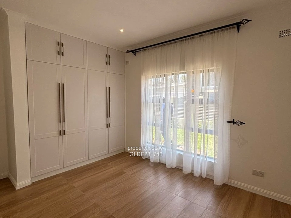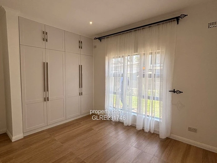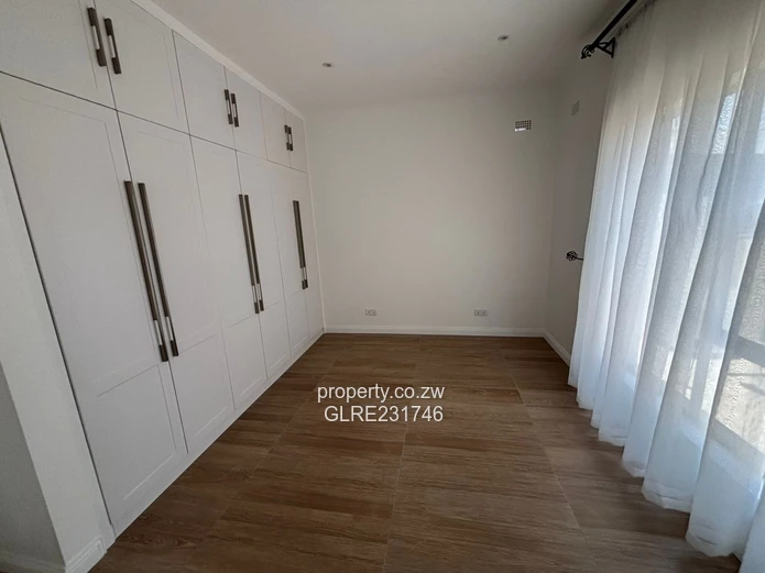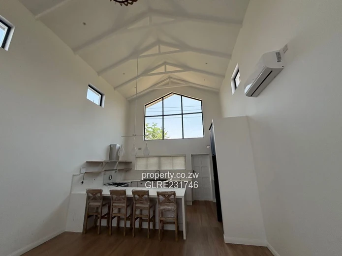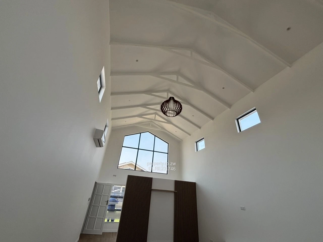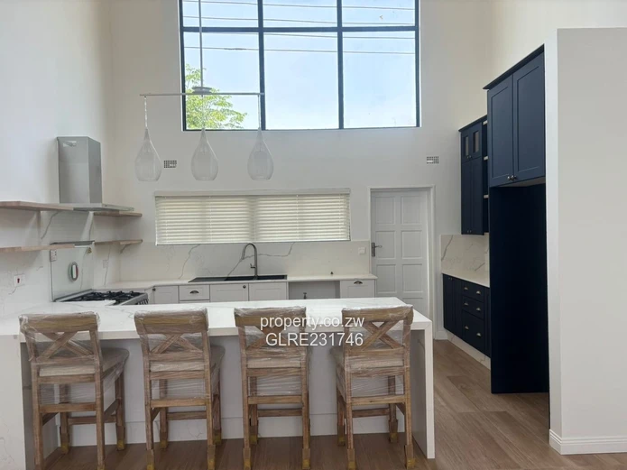 Modern, light-filled 4-bedroom, 4-bathroom apartment in prime Hatfield, Harare South — set on a generous 2,040 m² stand with 500 m² of stylishly finished living space. As seen in the photos, the striking façade features textured stone pillars, secure automated gate and electric fencing, plus on-roof solar geysers. Step inside to a dramatic double-height living area with cathedral ceilings and a large arched window that floods the space with natural light. The open-plan kitchen is fitted with a central island breakfast bar, marble-look countertops, navy cabinetry and pendant lighting — perfect for entertaining. Bedrooms are bright and airy with built-in wardrobes and tasteful finishes; multiple split-unit air conditioners keep rooms comfortable. Wooden-effect floors, elegant sheer window treatments and contemporary light fittings complete the interiors. Externally there’s lawn space and secure parking with a garage door visible from the street. A dependable borehole provides excellent water security — a major advantage in the area. Ideal for a professional family or executives seeking comfort, style and reliability in Hatfield; available for immediate occupation. Viewings by appointment.