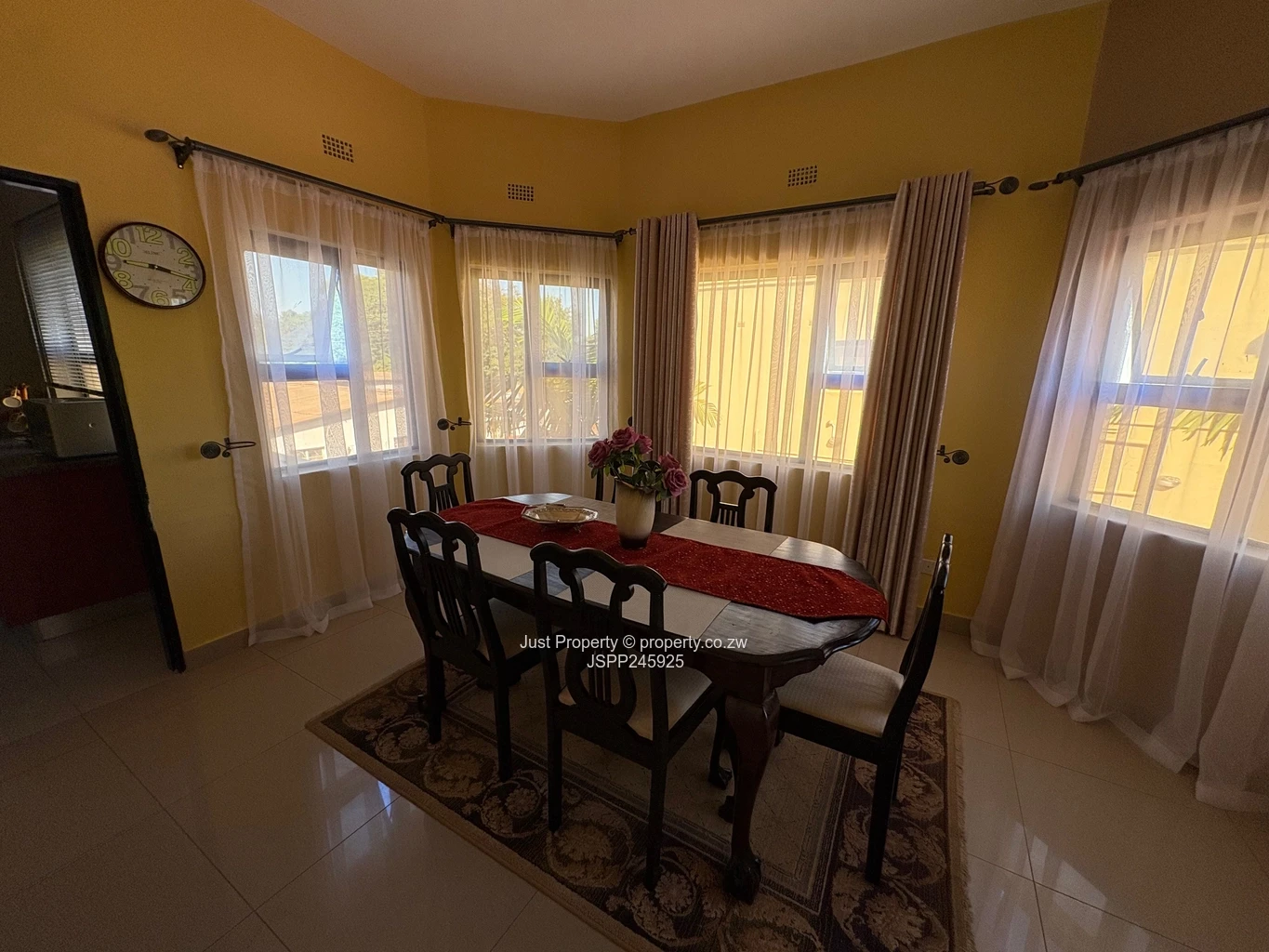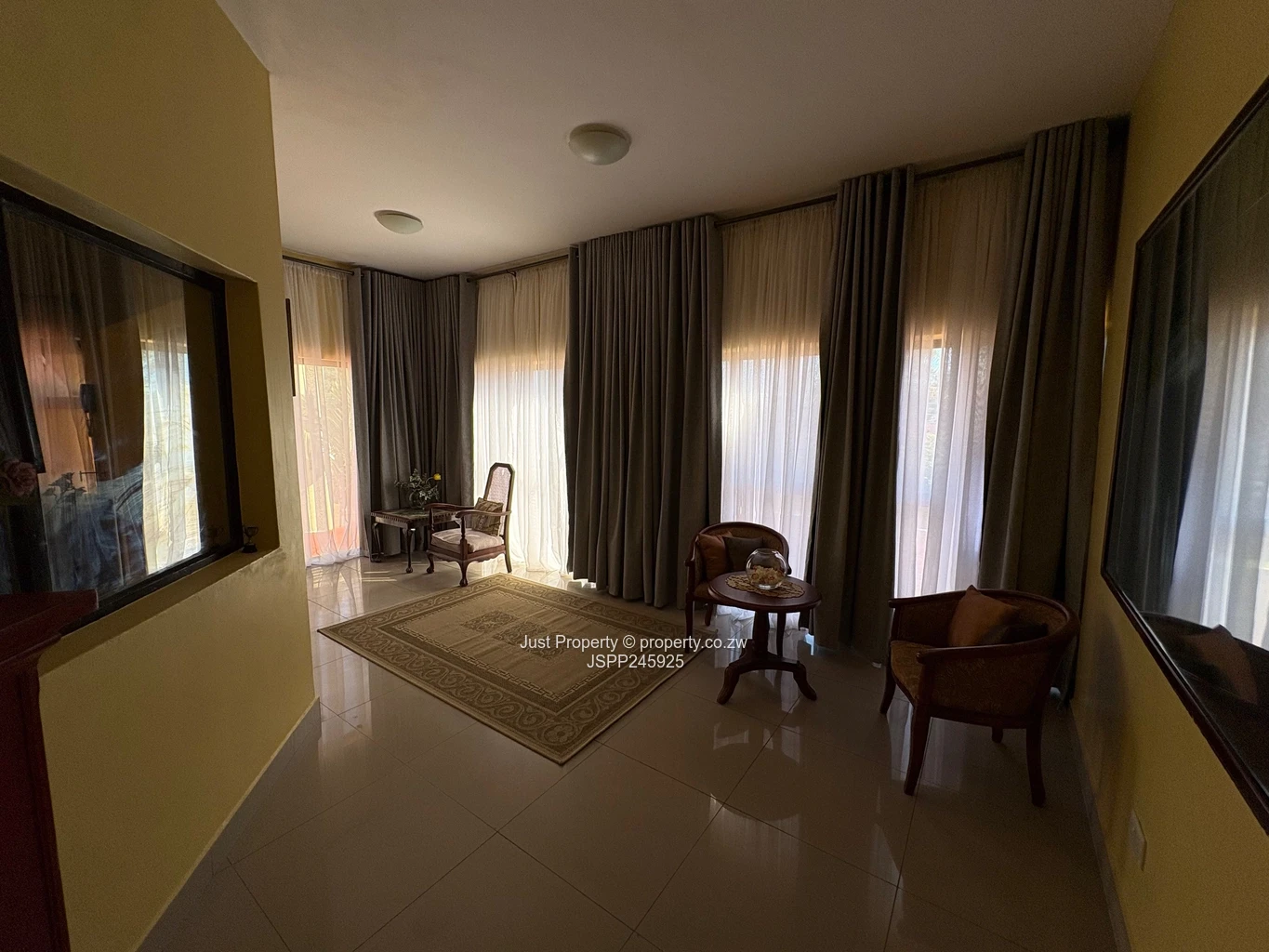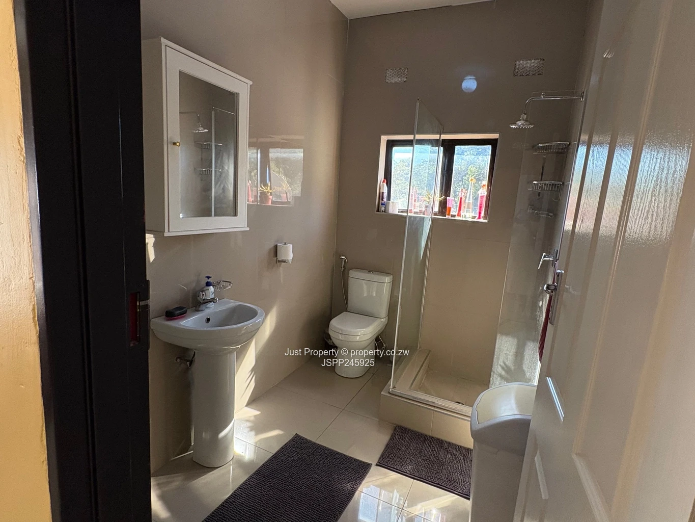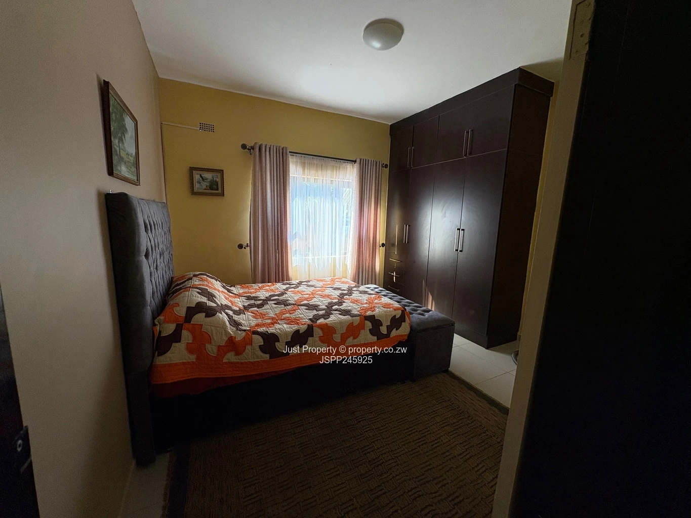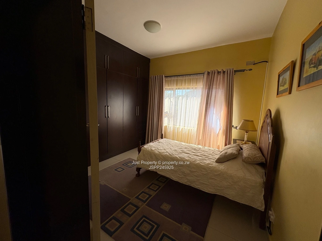 Spacious, sunlit 3-bedroom, 2-bath garden flat for rent in sought-after Emerald Hill, Harare West. This fully furnished 200 m² home blends comfort and style: a bright formal dining room framed by curved bay windows and sheer curtains lets in warm morning light, while polished tiled floors flow through the living spaces. The modern family bathroom features glossy tiles, a corner glass shower, pristine white sanitary ware and a turquoise vanity unit. Each bedroom is tastefully furnished with full beds, bedside tables, soft rugs and generous built-in dark wood wardrobes; the master bedroom is particularly large with room for a seating bench and enjoys abundant natural light. Thoughtful finishing touches throughout include neutral floor tiles, matching curtains and tasteful décor that creates an inviting, move-in-ready atmosphere. Practical amenities include a reliable borehole water supply and secure, well-maintained grounds typical of a garden flat with outdoor space. Ideally positioned in Emerald Hill, this property is perfect for professionals seeking an easy-care, beautifully presented rental. Arrange a viewing today to experience the quality and convenience of this fully furnished garden flat.