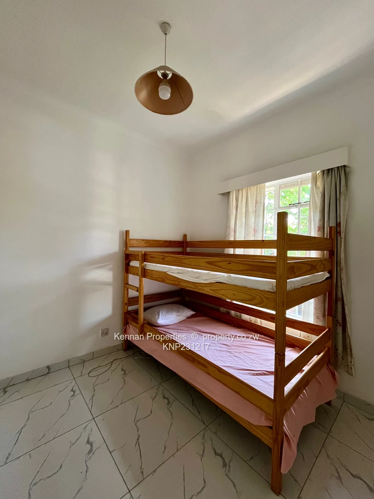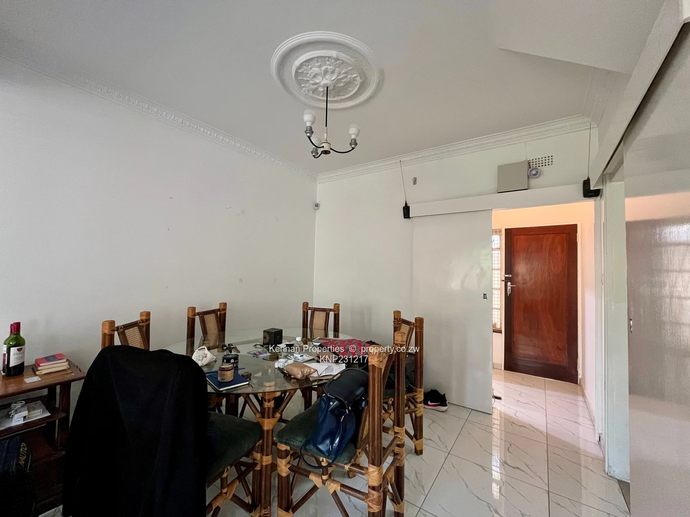 Neat and well-kept 3 bedroomed flat in a quiet, leafy street in the Avenues. Lounge, kitchen and guest loo downstairs, 3 bedrooms and bathroom upstairs. Small garden. Borehole services the complex. 1000L water tank. Excellent ZESA. Levy USD150 per month.