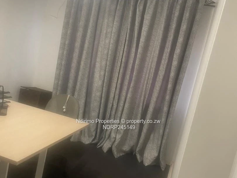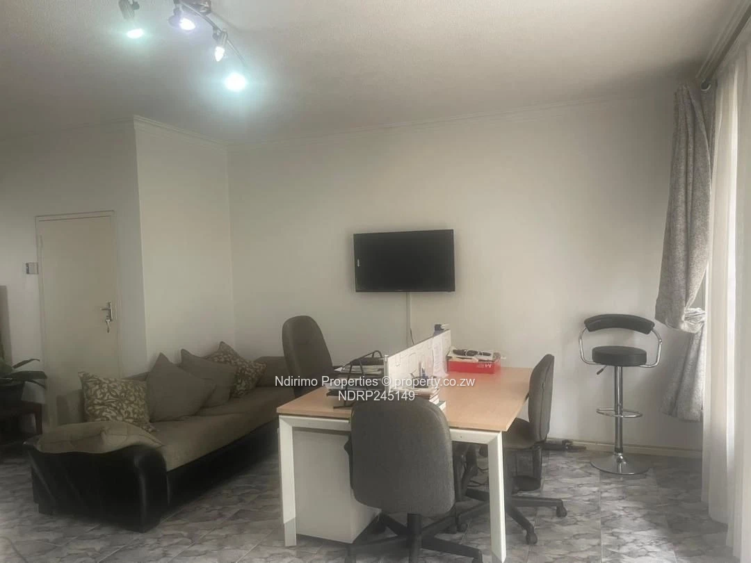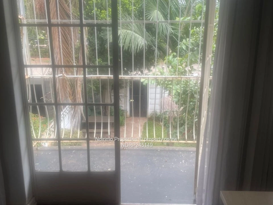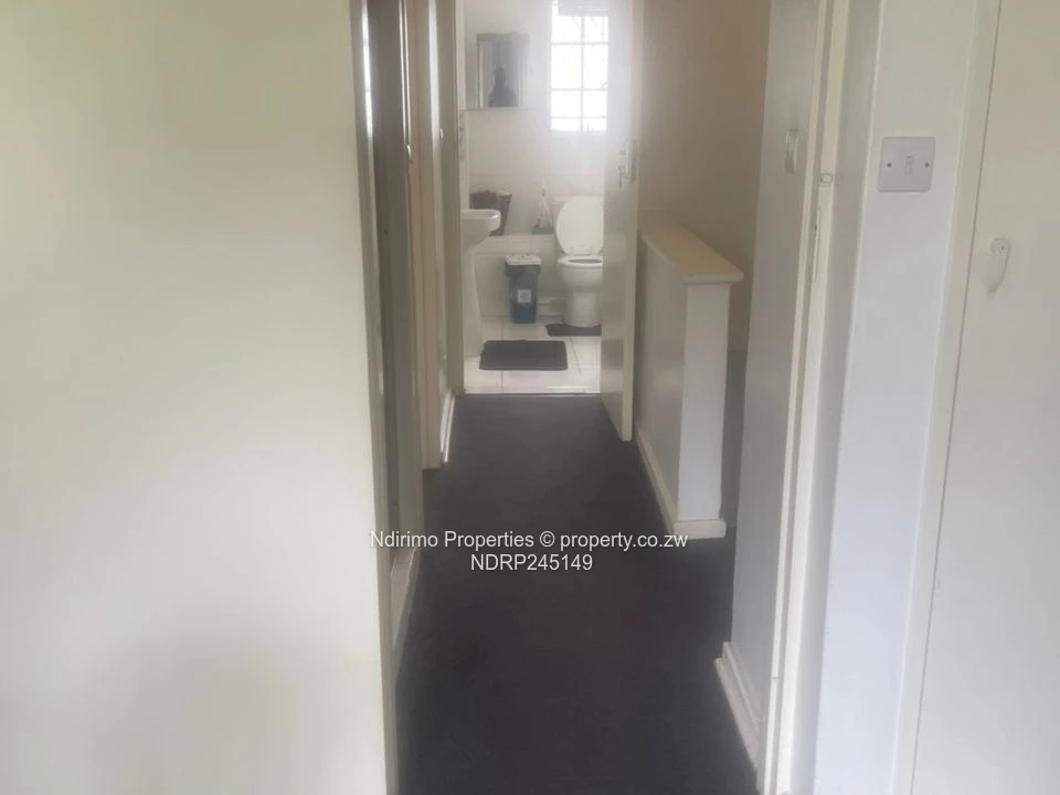 Chic 2-bedroom, 1-bath flat for rent in Harare City Centre (Harare CBD) — perfect for professionals or a small family. The secure, gated façade with sturdy burglar bars and a covered verandah welcomes you (as pictured). Inside you'll find a bright, modern fitted kitchen with white cabinetry, a built-in hob, extractor and breakfast bar ideal for quick meals (see kitchen photo). A carpeted staircase leads to the bedrooms; one room can double as a home office with heavy curtains for privacy. Step out onto the small balcony with metal balustrade overlooking a neat, paved garden and lawn — a peaceful private outdoor space. Property benefits include municipal water, a functional sewer system, reliable ZESA, a dedicated carport and 24-hour security for added peace of mind. Centrally located close to shops, banks and public transport in the CBD. Contact us today to arrange a viewing and see this well-maintained, secure flat for yourself.