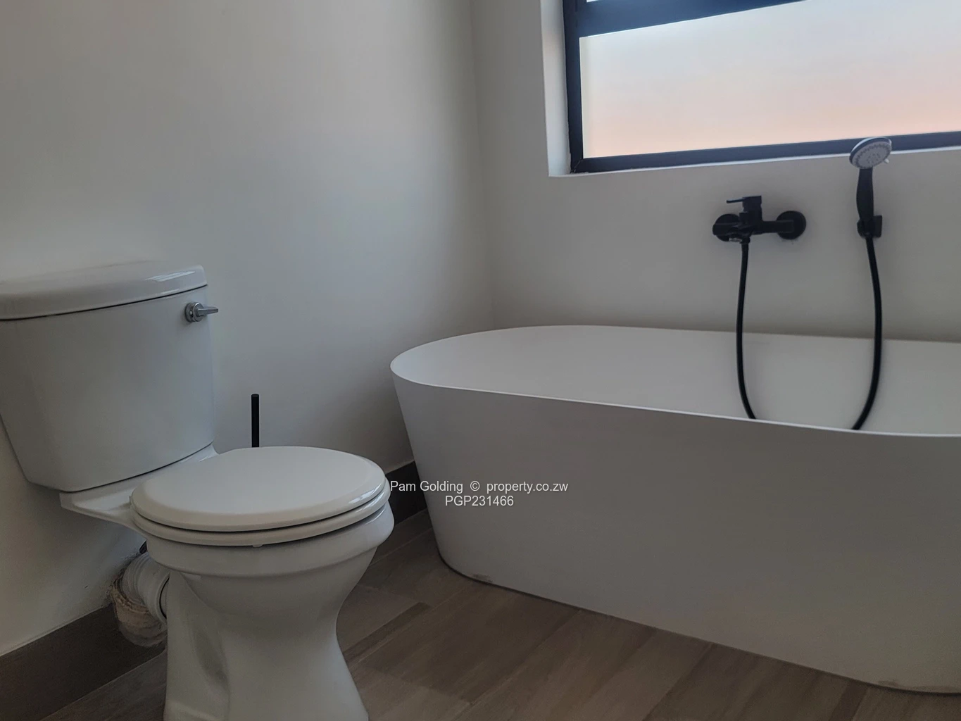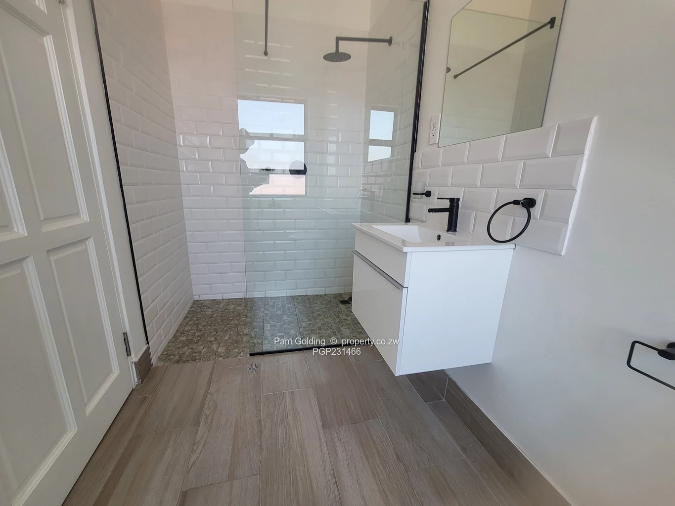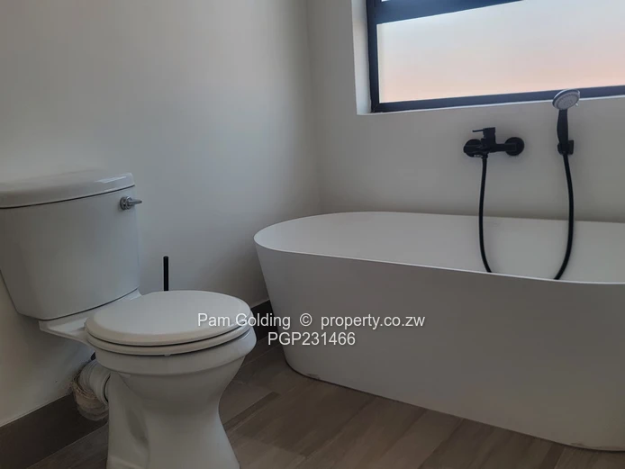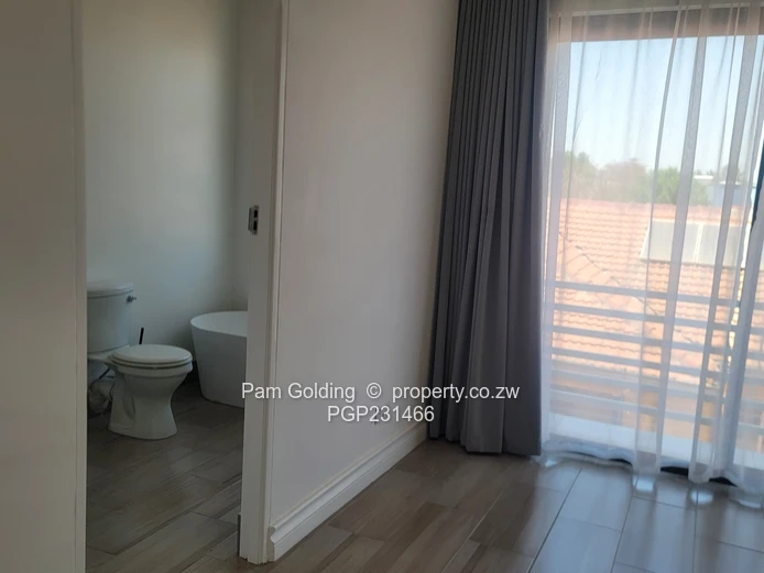 Entrance with guest WC on left, open plan living area with semi fitted kitchen (5 plate gas stove!). Good sized lounge leading to small rear garden. Storage space under stairs and 5kva invertor. Upstairs to 3 bedrooms, 2 with spacious shared bathroom and main with ensuite. State of the art security . Gas geysers.