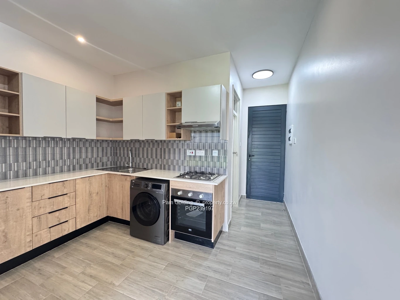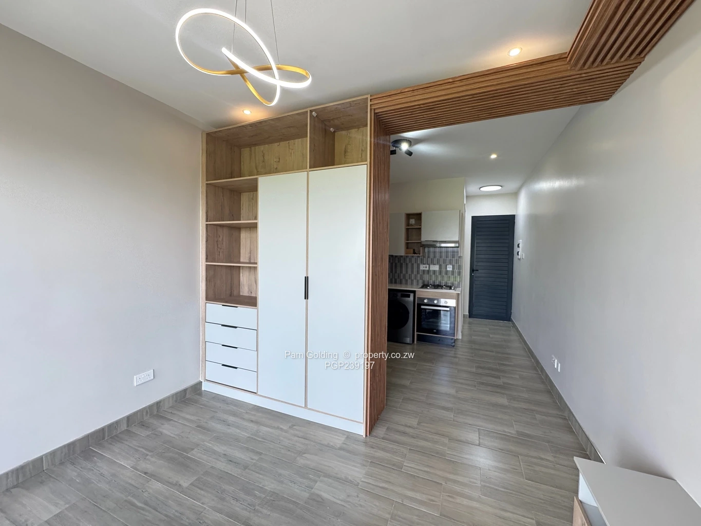 Modern studio apartment available to rent. Comprising separate bathroom, an open plan kitchen, and a bedroom which opens onto a private balcony. Kitchen contains a washing machine and fitted stove plus oven.
