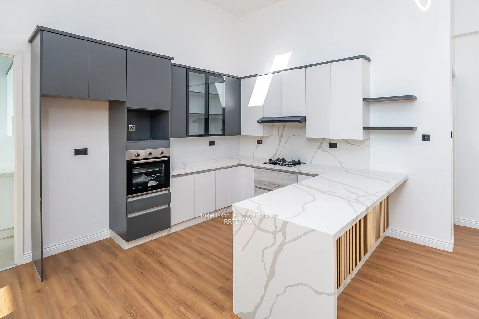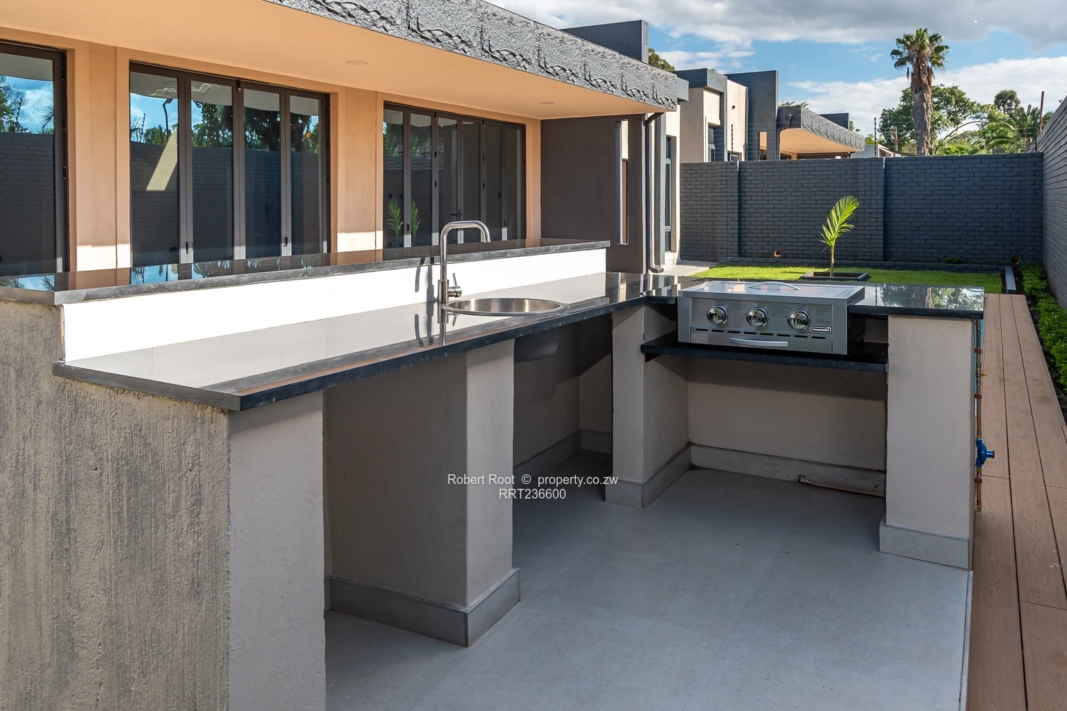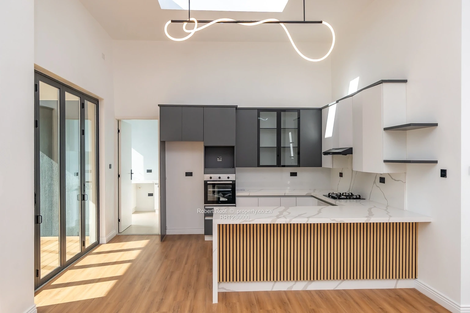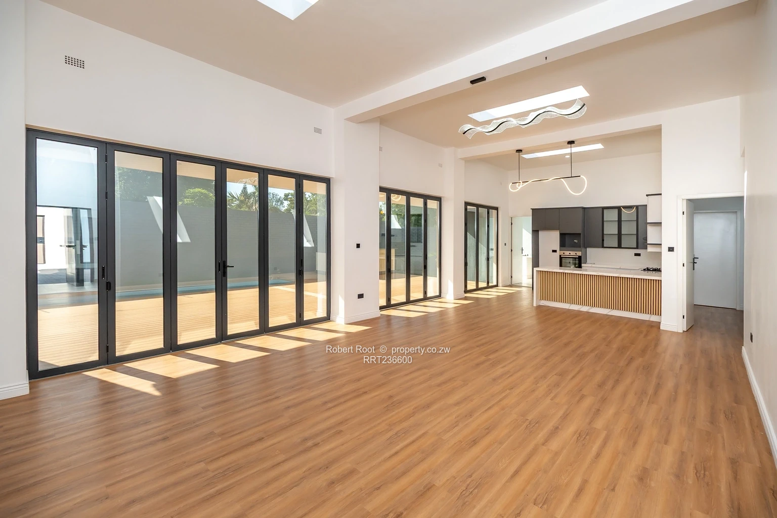 The front door leads on to the large open plan lounge with aluminum concertina glass doors which open out to a large deck with swimming pool and open area barbeque island complete with an outdoor hob. The kitchen is grey and white cabinetry giving a clean finish with a scullery tucked away.