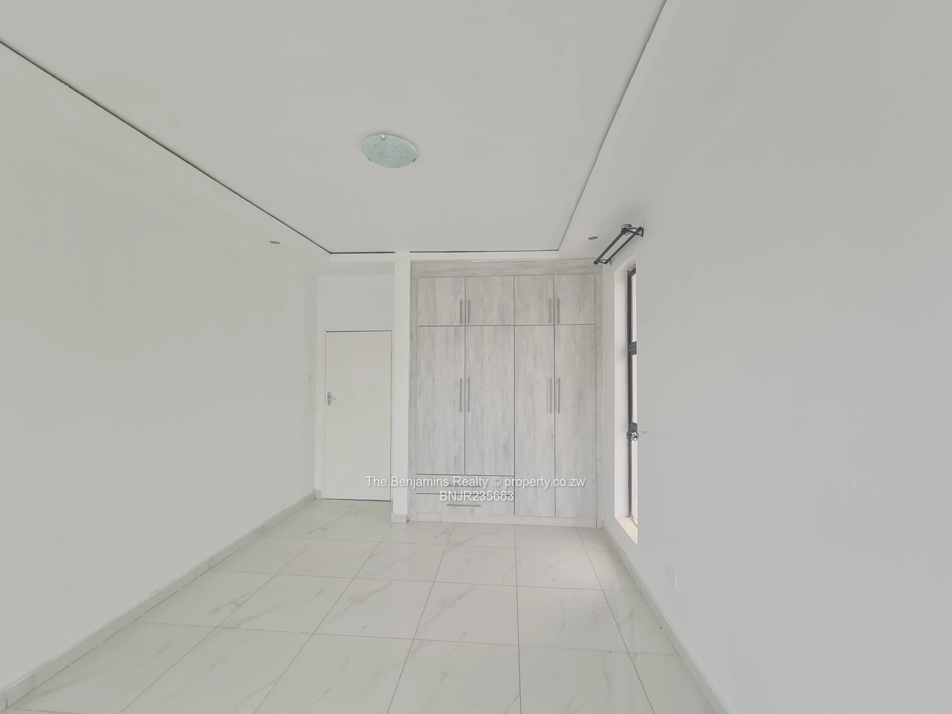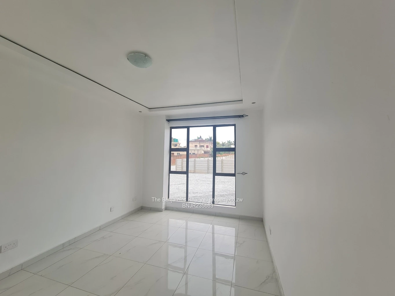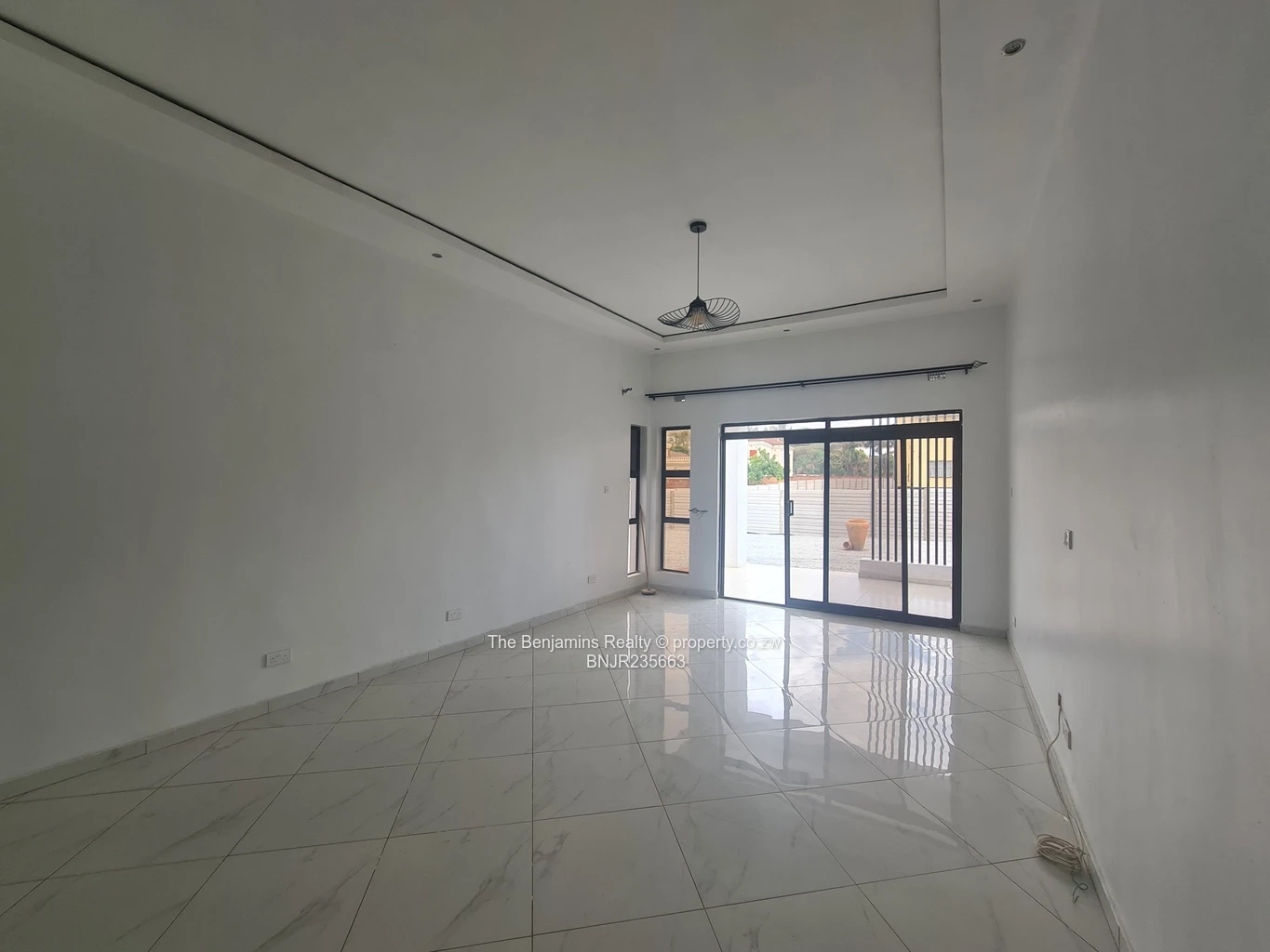 This delightful 3-bedroom, 2-bathroom townhouse in The Grange, Harare, marries modern design with practical living. The property boasts a contemporary architectural style, enhanced by large windows that flood the interior with natural light. An inviting entrance, adorned with vertical slats and an overhang, creates a stylish welcome.