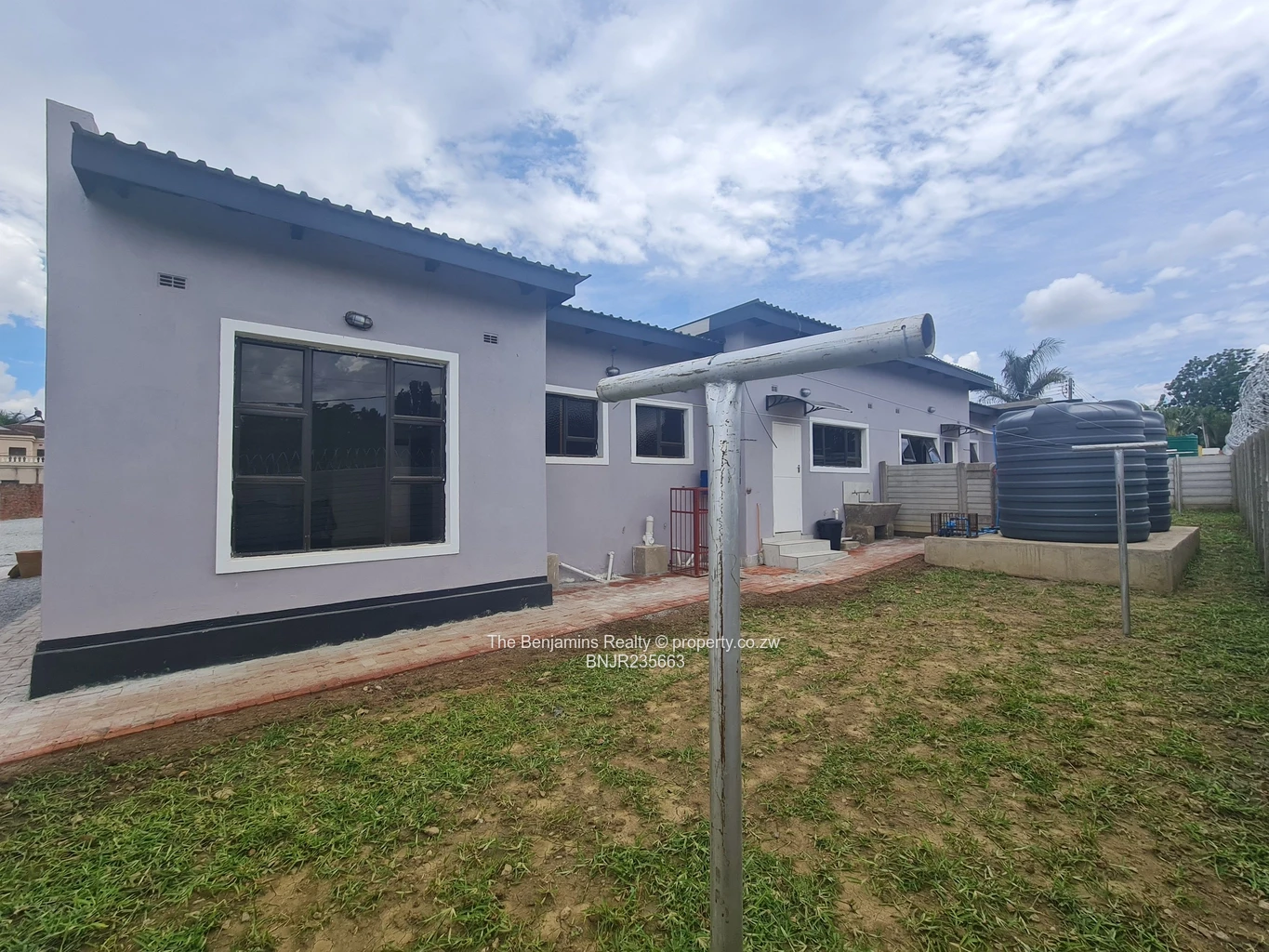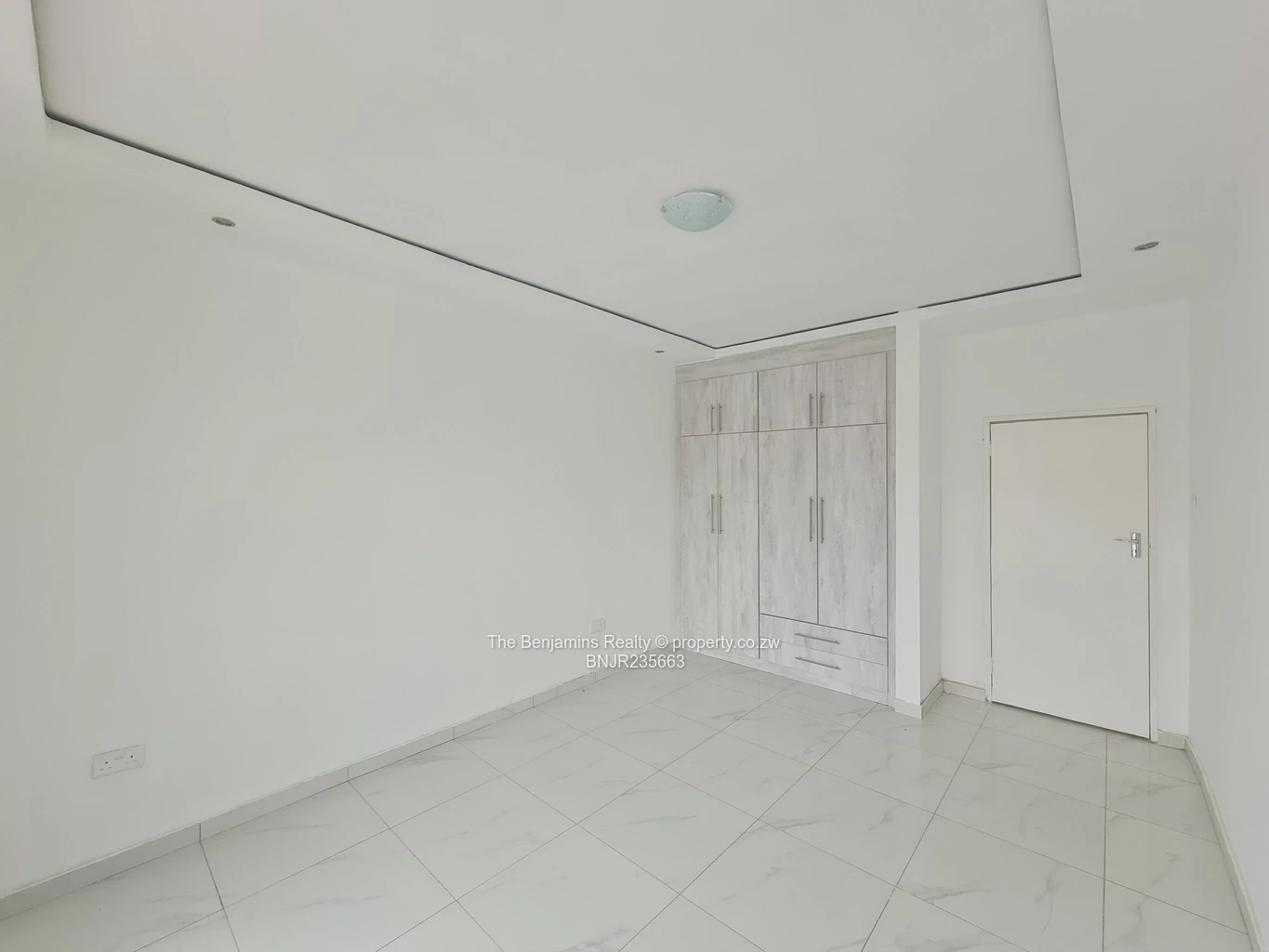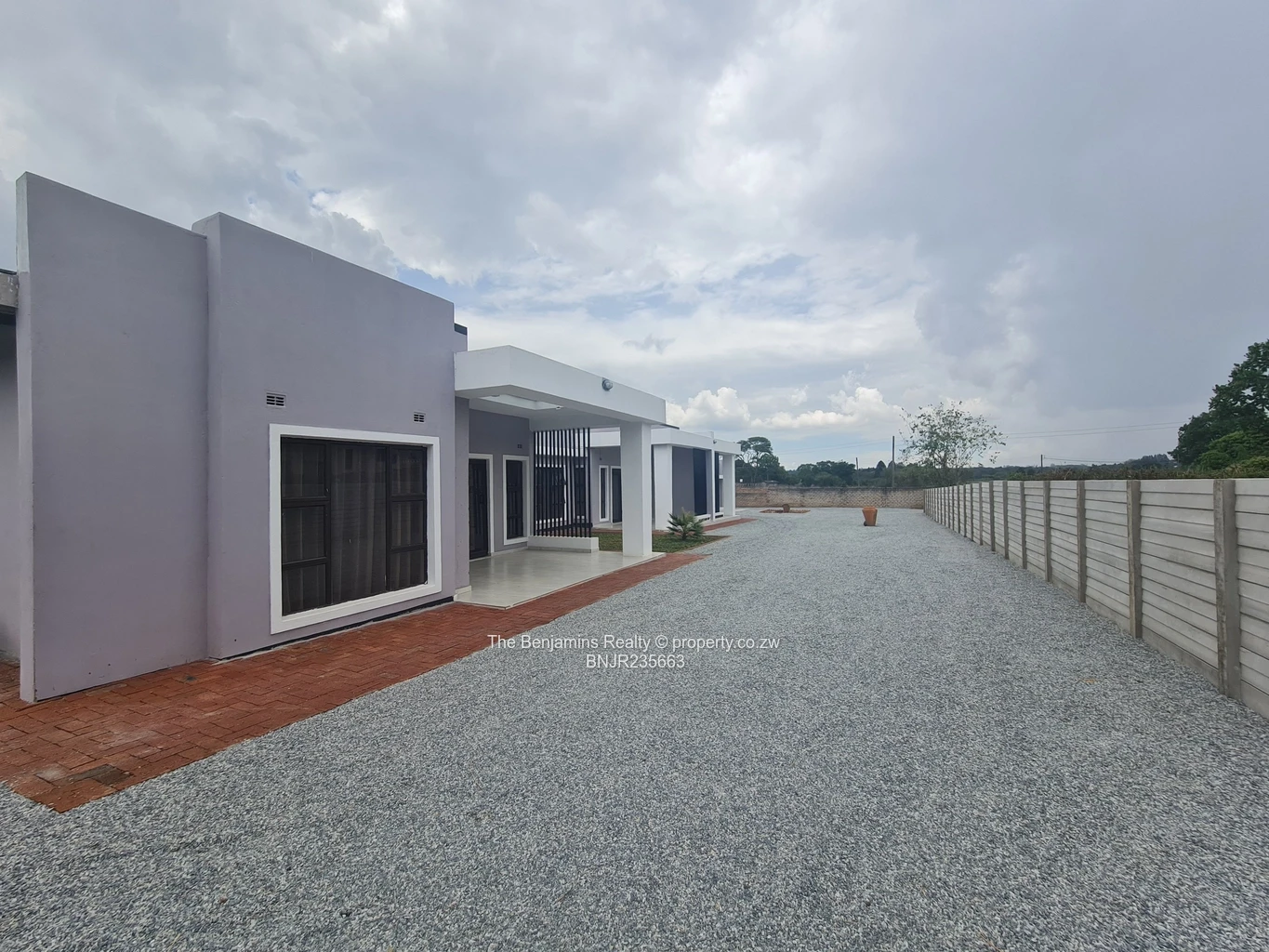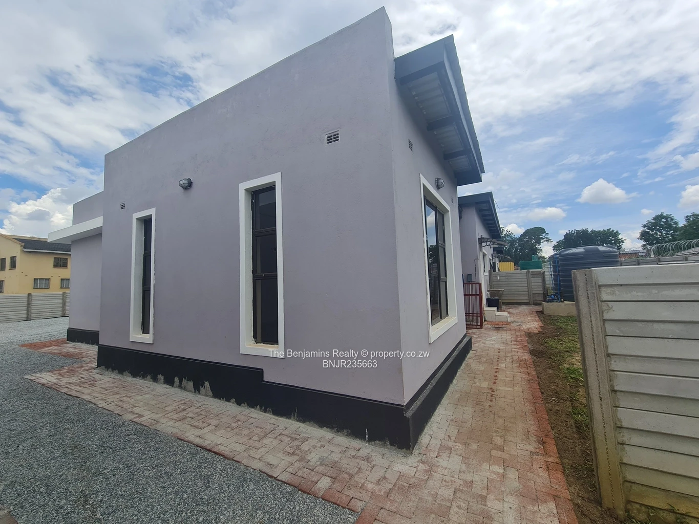 This delightful 3-bedroom, 2-bathroom townhouse in The Grange, Harare, marries modern design with practical living. The property boasts a contemporary architectural style, enhanced by large windows that flood the interior with natural light. An inviting entrance, adorned with vertical slats and an overhang, creates a stylish welcome.