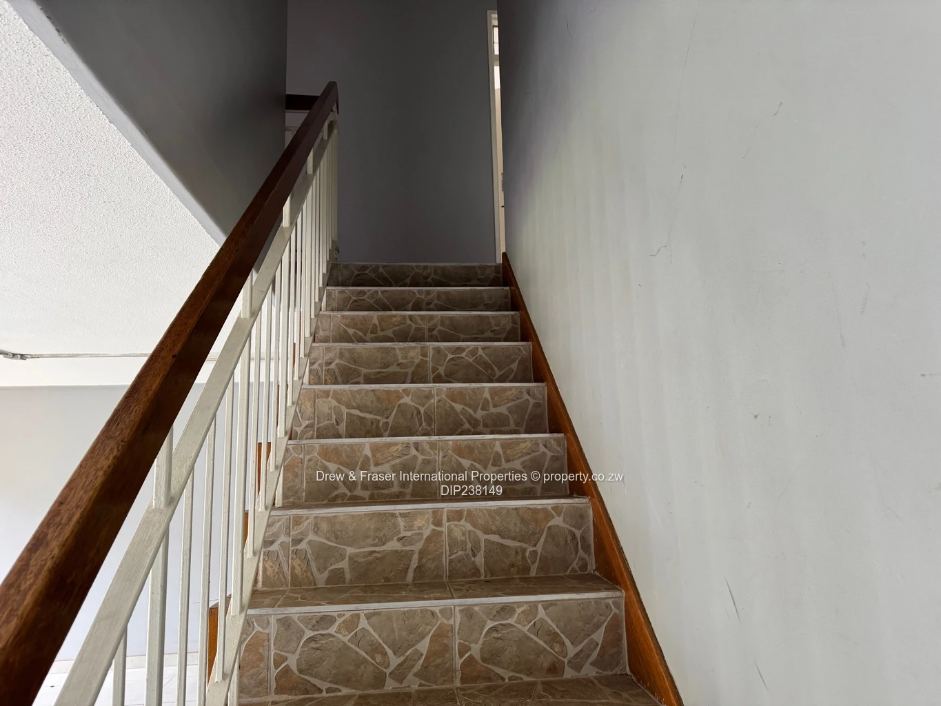 All three bedrooms offer built-in wardrobes and generous window light, and the bathrooms are fully tiled with a bathtub. A neat internal staircase and landing add character and extra storage potential. The property sits in a secure brick compound with paved driveways and sheltered archways, and importantly includes a borehole to ensure steady water supply.