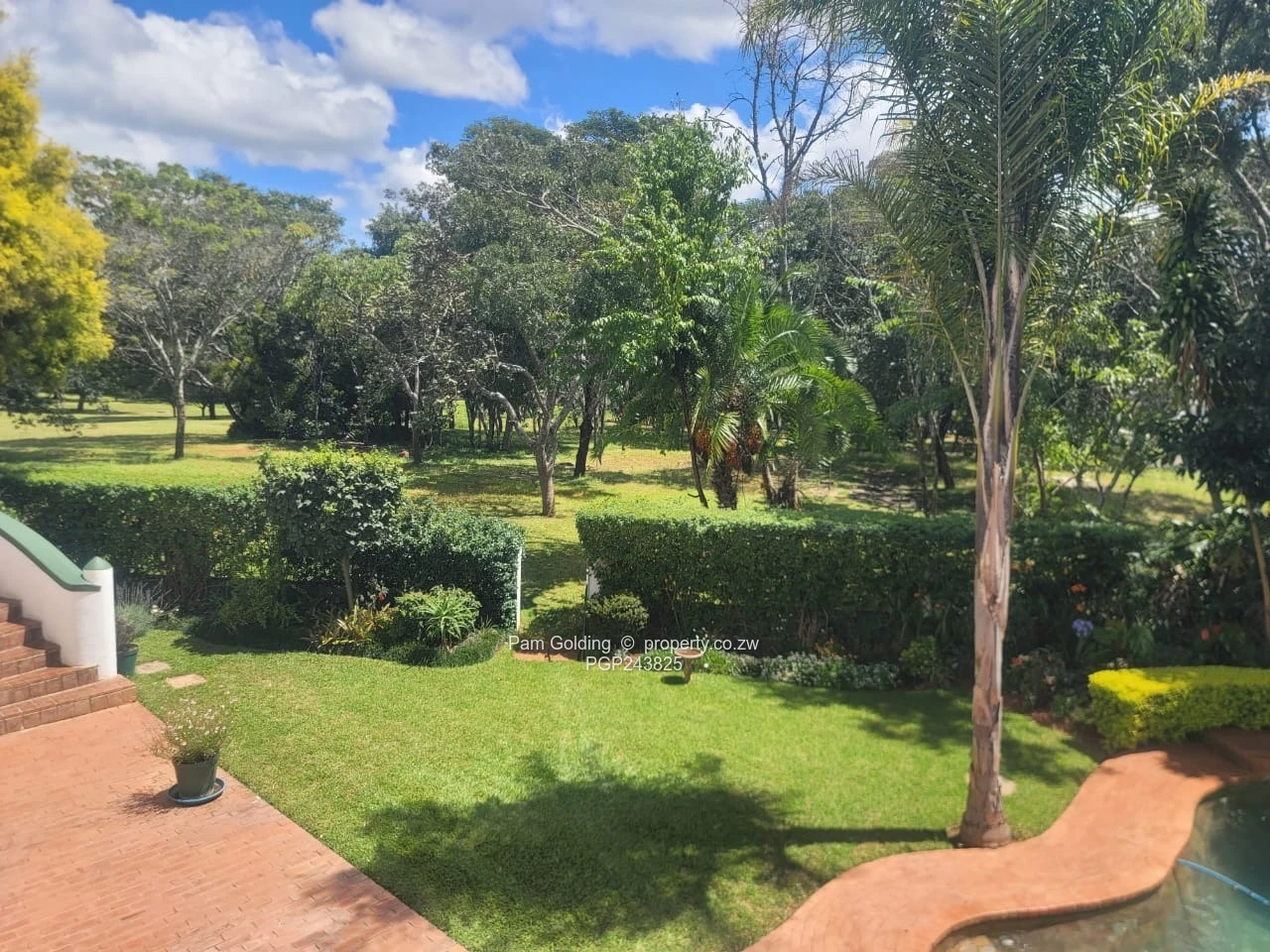 Sparkling pool and mature garden.