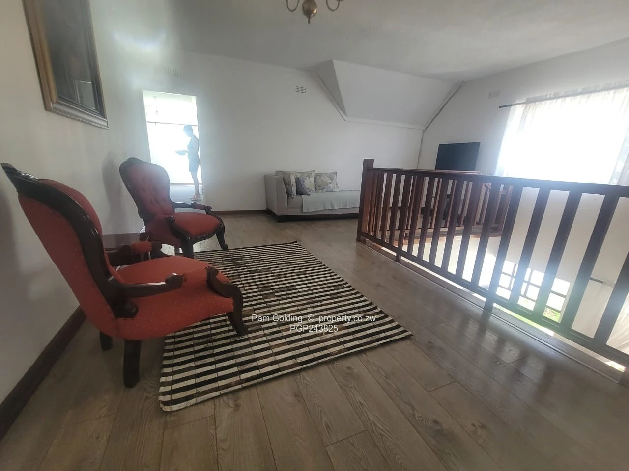 The upper floor has a gallery overlooking the entrance hall, 2 bedrooms, a small gym or study, and a shared bathroom.
