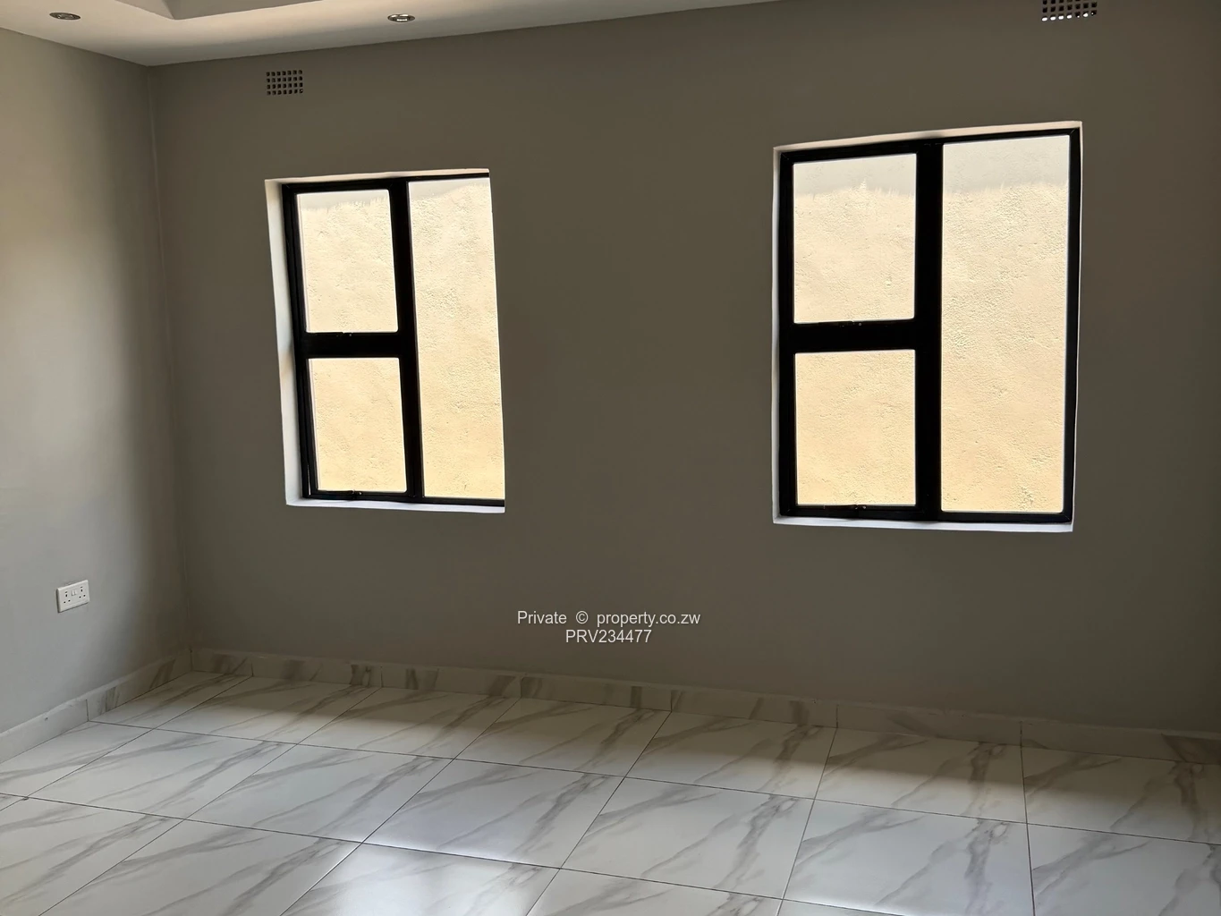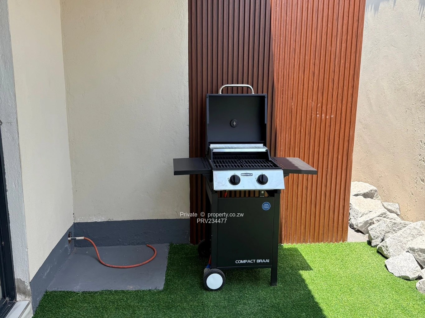Outside, a secure paved courtyard and allocated parking/garage space provide convenience; an outdoor braai area with a gas grill is shown for relaxed weekend hosting. The property sits in a well-kept compound of low-rise homes and benefits from its own borehole — ensuring water security. Ideal for professionals or a small family seeking comfort, style and low-maintenance living in a desirable Harare North suburb. Arrange a viewing today to experience this garden flat firsthand.