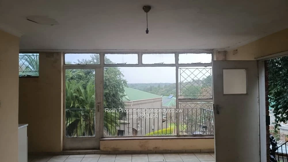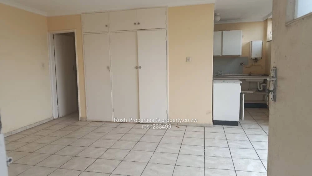 Quiet Bachelor's garden flat to rent in Greystone Park, Harare North — ideal for a single professional or couple. This open plan bachelor's suite has adequate sitting, bed area and a kitchenette space plus one-bathroom unit sits on an 65 m² plot with a building area of 100 m² and offers practical, comfortable living in a leafy, well-kept complex. As shown in the photos, the flat opens into a tiled open-plan lounge and kitchenette with built-in cupboards and a large picture window and small balcony that frame pleasant garden and treed views.