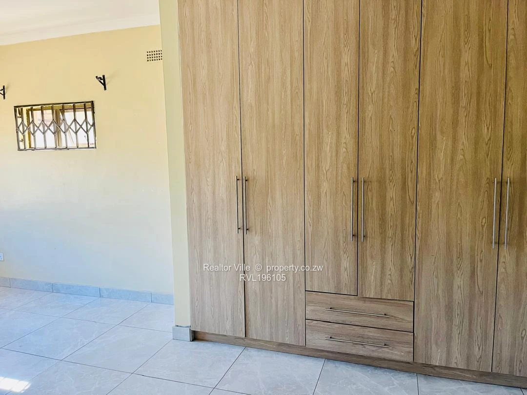 Light-filled 3-bedroom, 2-bathroom garden flat in sought-after Greendale, Harare East — 150 m² of comfortable living on a neat 200 m² plot. The exterior presents a tidy single-storey cluster with tiled roofs, paved parking and a sheltered carport/covered parking area, plus a small lawn and welcoming veranda with columns (as pictured). Inside, enjoy a bright open-plan living and dining space with glossy tiled floors, decorative ceiling cornices and large windows protected by security bars that flood rooms with natural light. The modern kitchen features a breakfast bar, ample built-in cabinetry and a practical layout for everyday living. Bedrooms come with fitted wardrobes; the bathrooms are well-appointed — one with a full bath and the other with a shower cubicle — finished in easy-care tiles. Practical extras include an enclosed courtyard, a secure gate and a borehole for reliable water supply. Ideal for professionals, small families or downsizers seeking low-maintenance living close to local amenities, schools and main routes in Greendale. Viewings by appointment — contact us to arrange a private tour and see this neat garden flat for yourself.