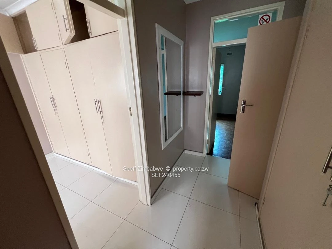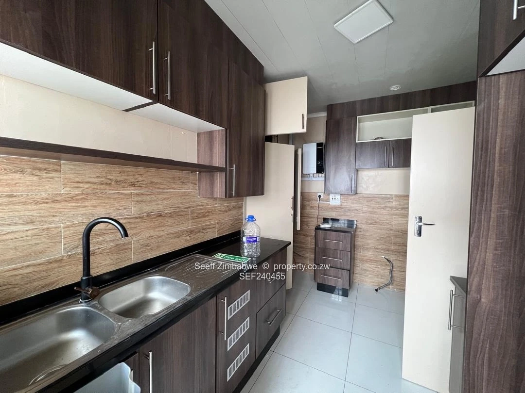 This neat apartment features an open-plan lounge and dining area with porcelain tiles, fitted mirrors, and a finished ceiling. The fitted kitchen comes with granite countertops, ample cupboards, porcelain tiles, and solar invertor
