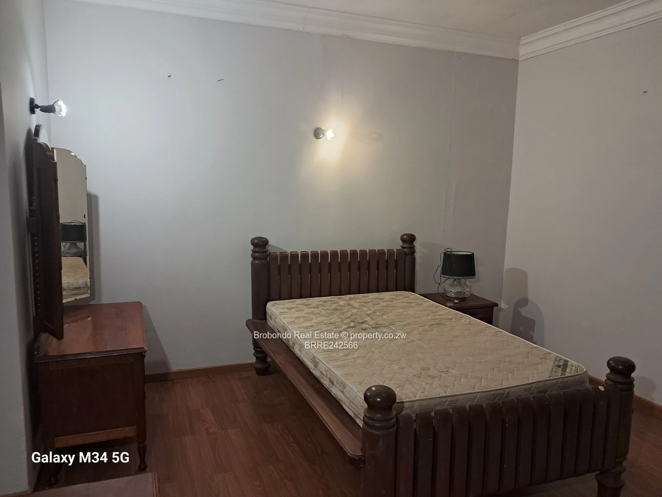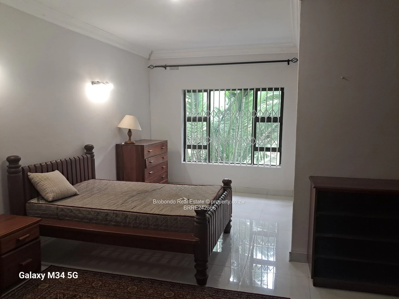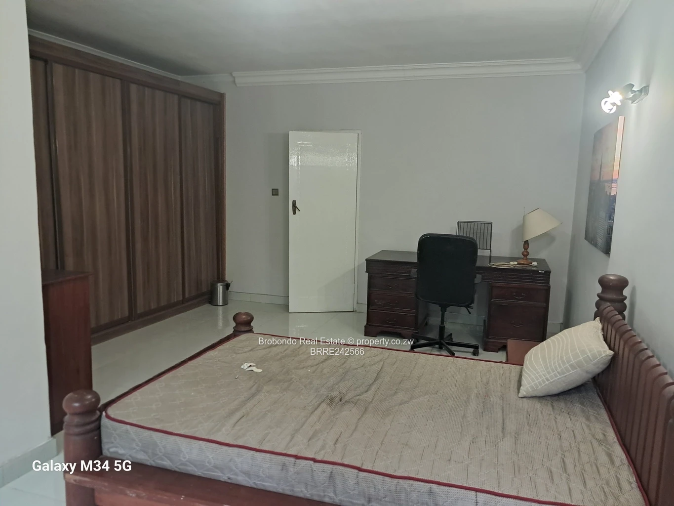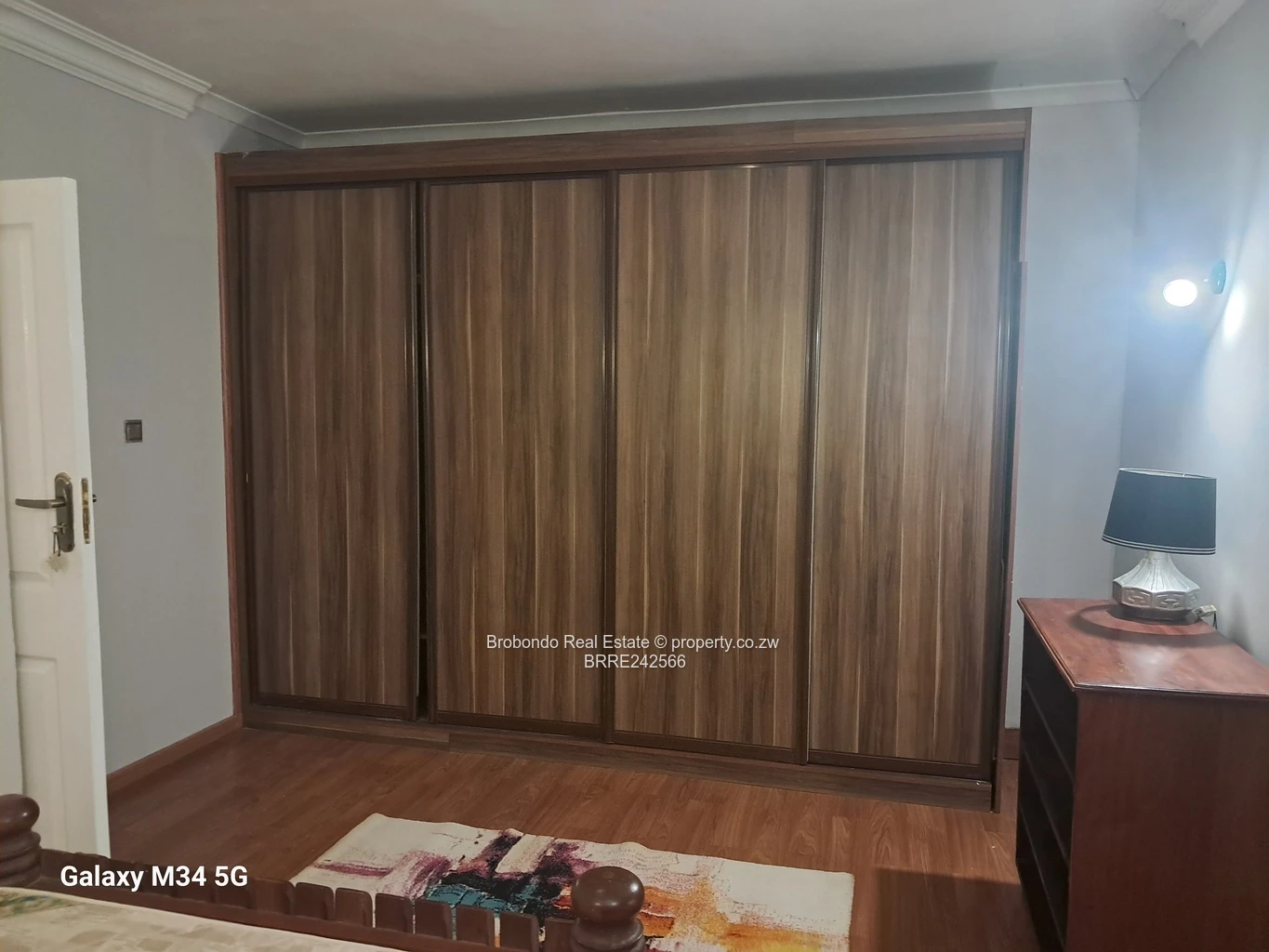 For immediate occupation is this beautiful solid fully furnished house for rental and it is available for immediate occupation. Its features are as follows: Double lockup garage and the ground floor and a basement spacious bedroom with own toilet and bath, First floor comes with a 4 bedrooms with built-in cupboards and own ensuites, beds in all bedrooms, lounge with set of kirsty leather lounge suite and an ovelooking balcony for fresh air, dining with dinings suite chairs, fitted kitchen with a gas stove, kitchen nuke, pantry, 5kv solar back up system, Zol Wi-fi internet connection, guest toilet, Master bed with a bed, dressing closet and ensuite, prolific borehole connected to 3 x 10 000litre water tank and a 5000l water tank, solar geyser 150l, electric geyser, paved driveway, electric fence, well manicured yard, laundry room, shared swimming pool, zesa, electric gated with an intercom, walled, veranda. This property is fully furnished. Contact us today!