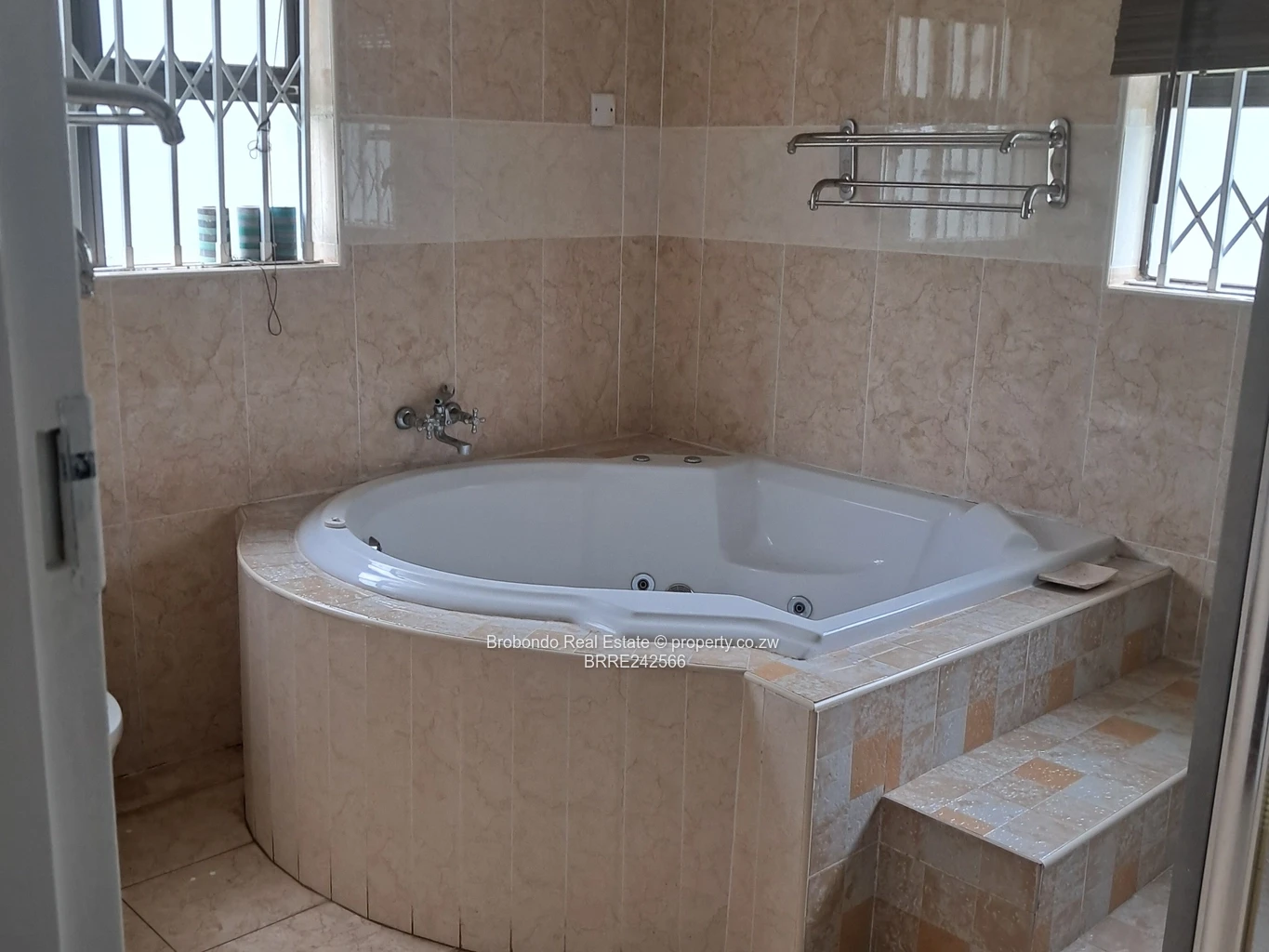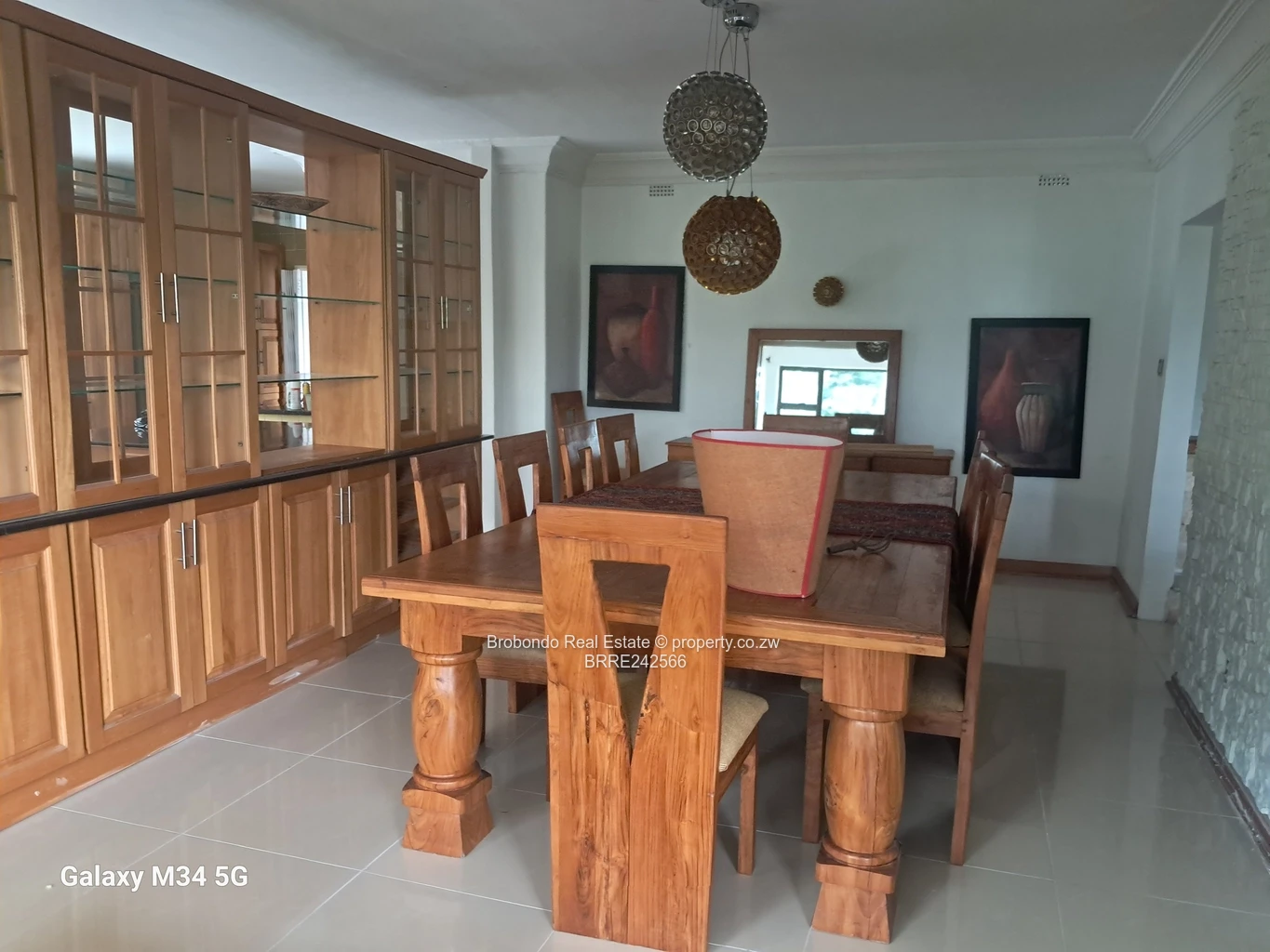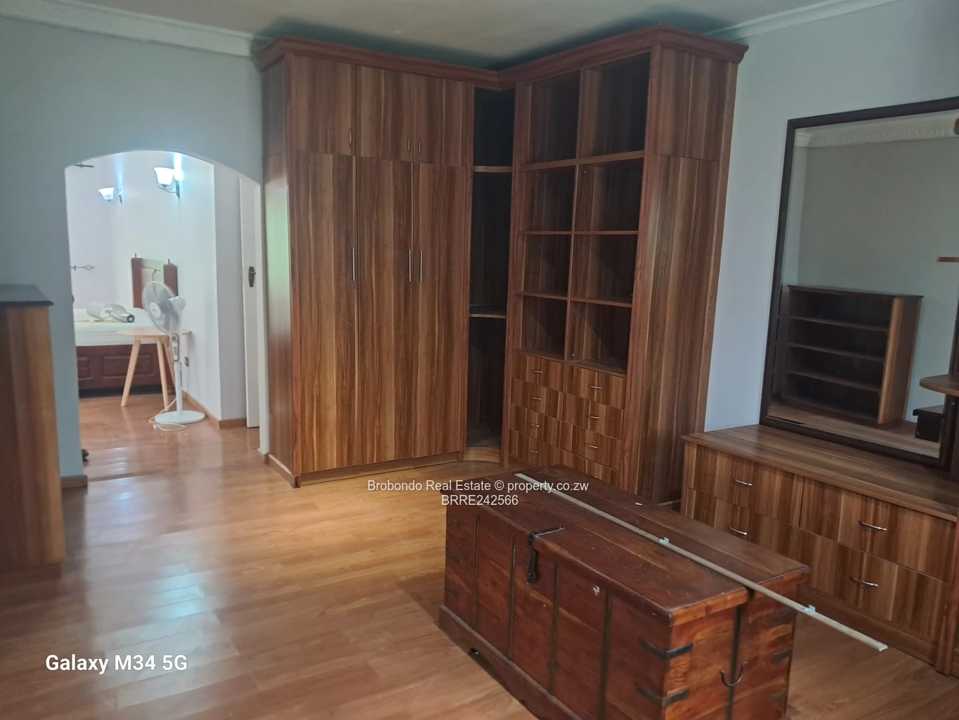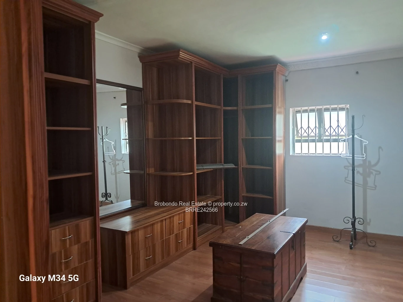 For immediate occupation is this beautiful solid fully furnished house for rental and it is available for immediate occupation. Its features are as follows: Double lockup garage and the ground floor and a basement spacious bedroom with own toilet and bath, First floor comes with a 4 bedrooms with built-in cupboards and own ensuites, beds in all bedrooms, lounge with set of kirsty leather lounge suite and an ovelooking balcony for fresh air, dining with dinings suite chairs, fitted kitchen with a gas stove, kitchen nuke, pantry, 5kv solar back up system, Zol Wi-fi internet connection, guest toilet, Master bed with a bed, dressing closet and ensuite, prolific borehole connected to 3 x 10 000litre water tank and a 5000l water tank, solar geyser 150l, electric geyser, paved driveway, electric fence, well manicured yard, laundry room, shared swimming pool, zesa, electric gated with an intercom, walled, veranda. This property is fully furnished. Contact us today!