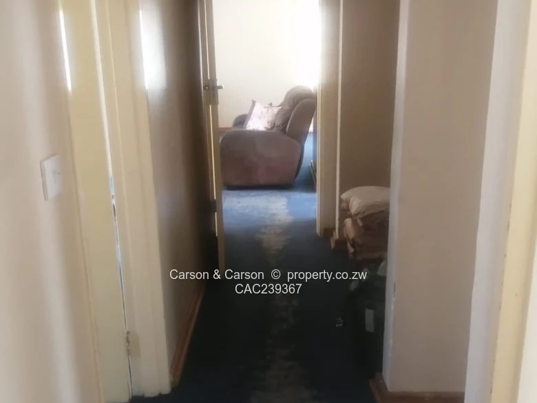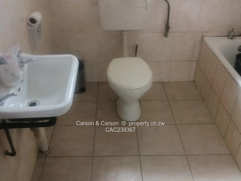 Spacious 3-bedroom, 2-bathroom family home for rent in quiet Msasa Park, Harare South. This neat single-storey house is fully walled with a metal gate and coil razor wire for peace of mind (see front elevation image). The property features a covered verandah and an attached carport/lock-up garage, plus ample off-street parking). The main bedroom is generously sized main bedroom with en-suite two additional bedrooms are well-proportioned and accessed via a central hallway. Bathrooms are fully tiled and practical: one full bathroom with bath and basin, plus a separate tiled toilet (photos provided).