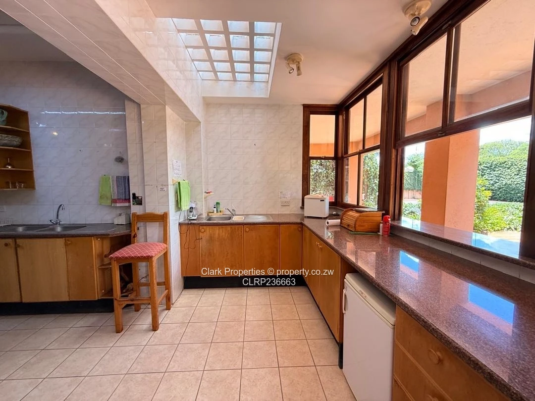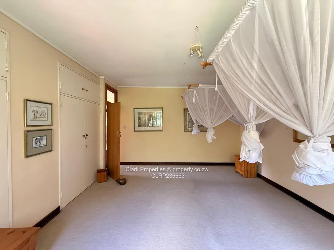 Staff quarters provide four bedrooms, separate ladies and gents toilets, a kitchen, and geyser powered by ZESA. A charming cottage complements the main house, featuring an open-plan lounge and kitchenette with built-in cupboards and a bedroom ensuite with bath.