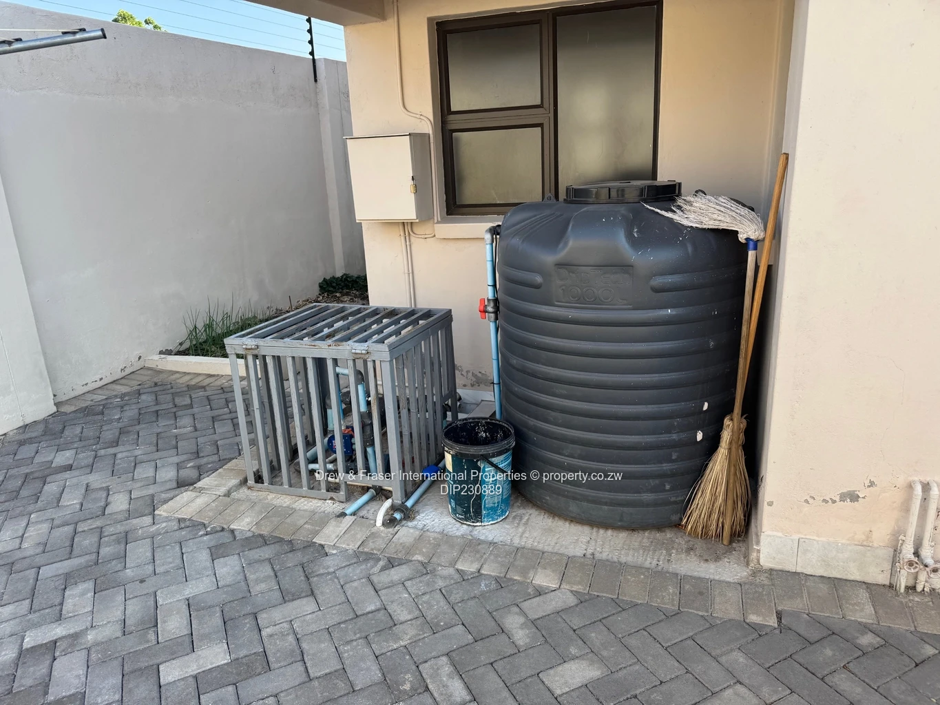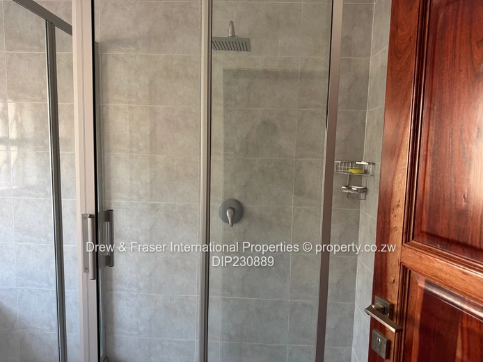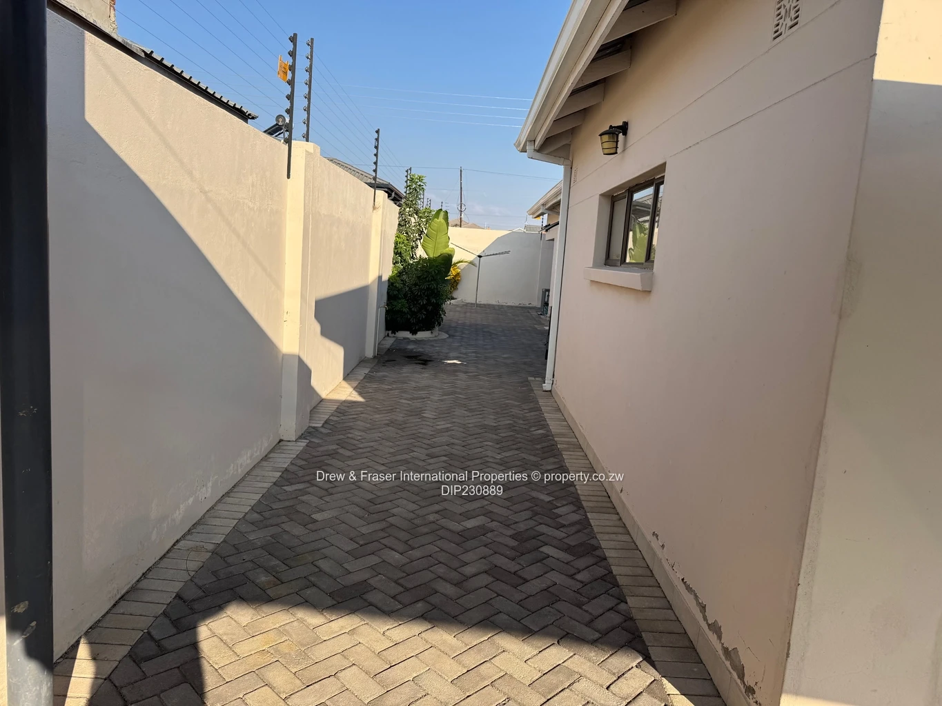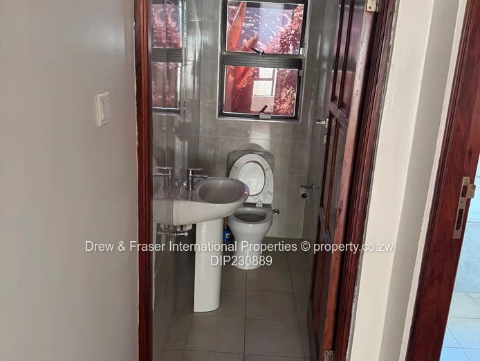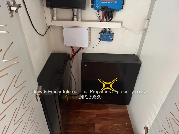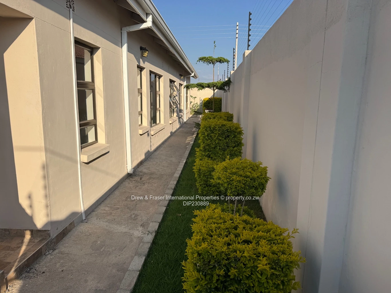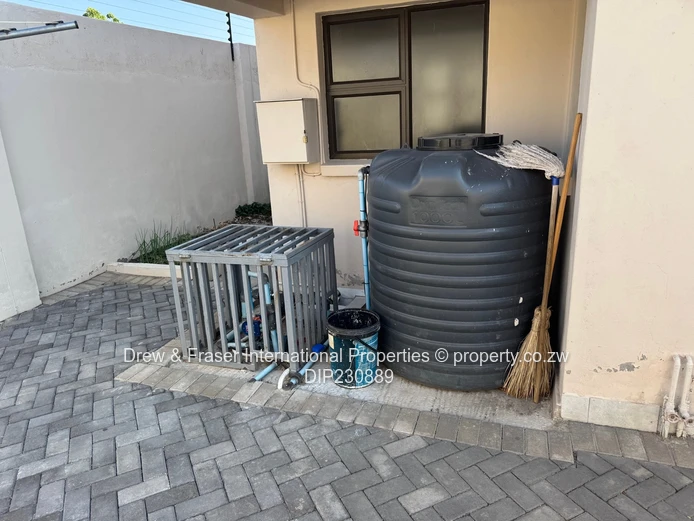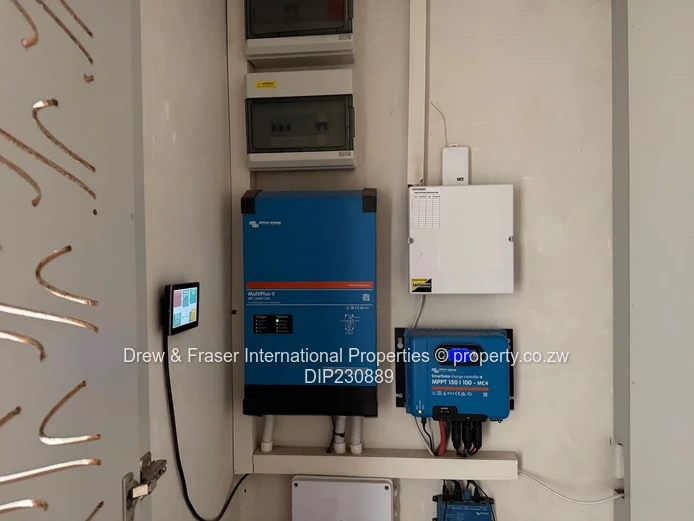 Both bathrooms are contemporary: one with a freestanding bathtub plus a frameless glass shower, the other with a fully tiled shower — elegant fixtures and clean finishes throughout. Outside, neat landscaped hedging lines the paved side walkways and secure high walls provide privacy. Practical extras include a large water tank and borehole pump installation, plus an inverter and battery/solar-ready power setup for reliable backup supply. Compact, low-maintenance grounds and secure perimeter make this property ideal for a family or professionals wanting comfort and dependable utilities in Mabvazuva. Available for immediate move-in.