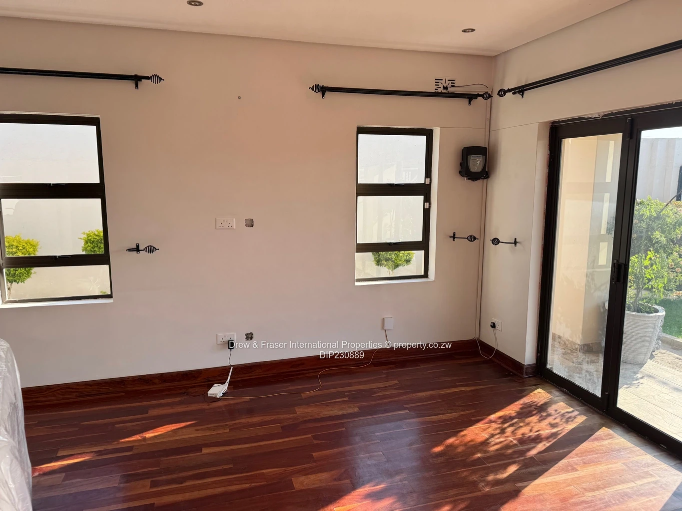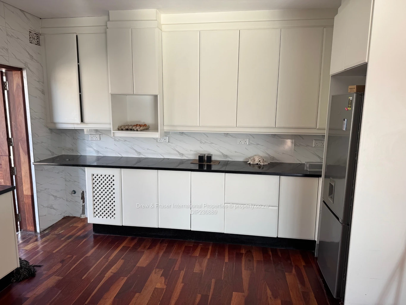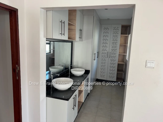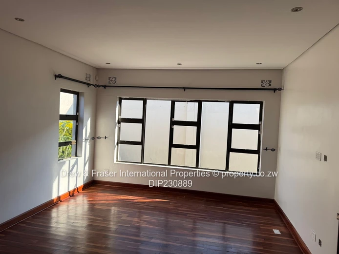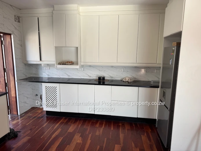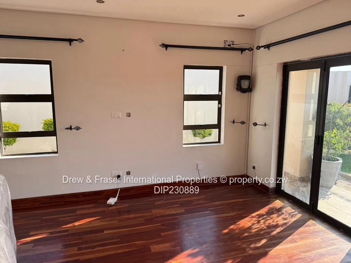 Beautiful, secure 3-bedroom, 2-bathroom house for rent in Mabvazuva, Ruwa (Mashonaland East) — 400 m² land, 198 m² building. Immaculately presented and flooded with natural light, the home features a bright open-plan living area with polished wooden floors and large windows/sliding doors that flow to a private paved courtyard. The modern kitchen is fitted with crisp white cabinetry and practical worktops, offering plenty of storage and prep space.