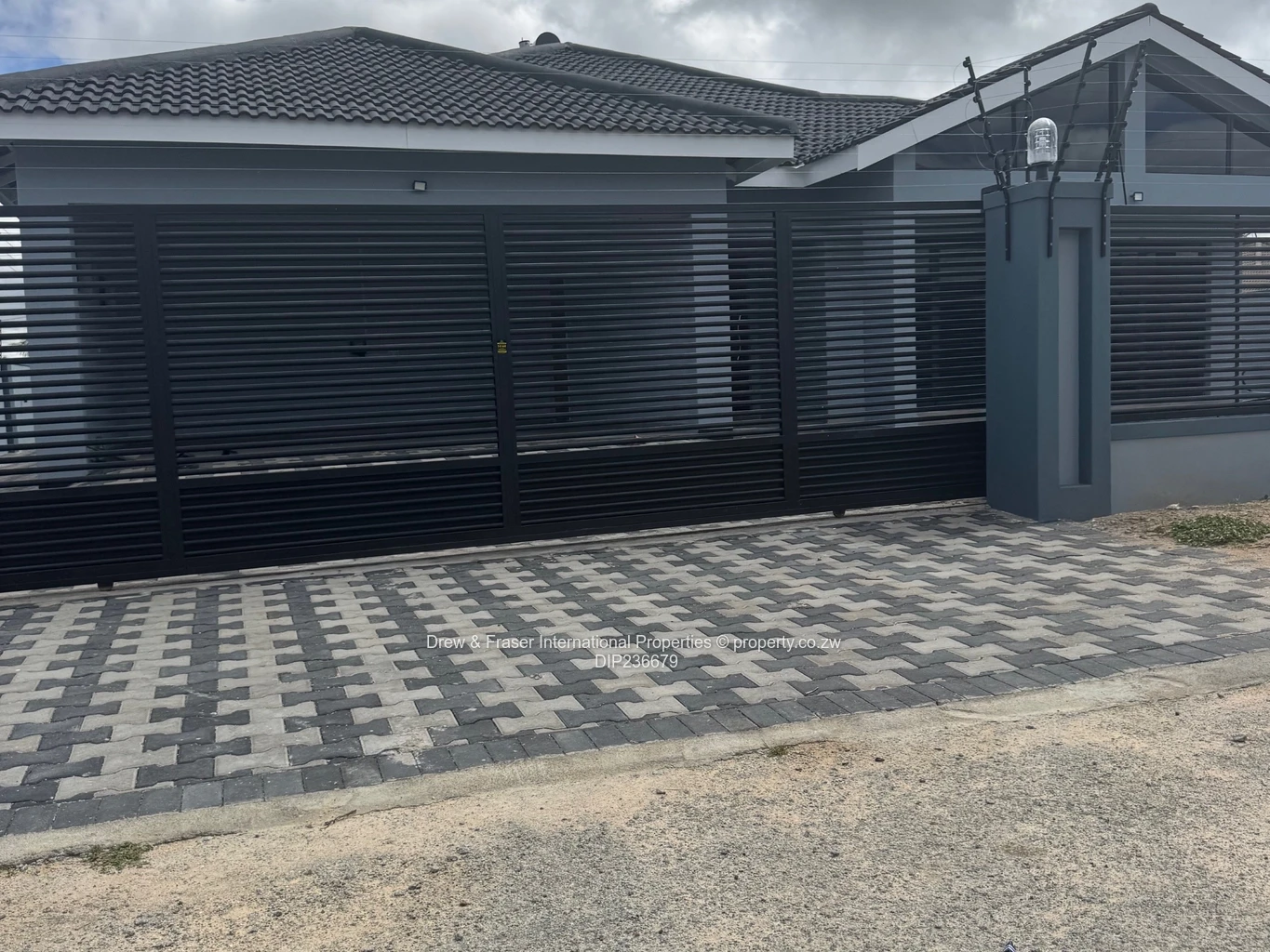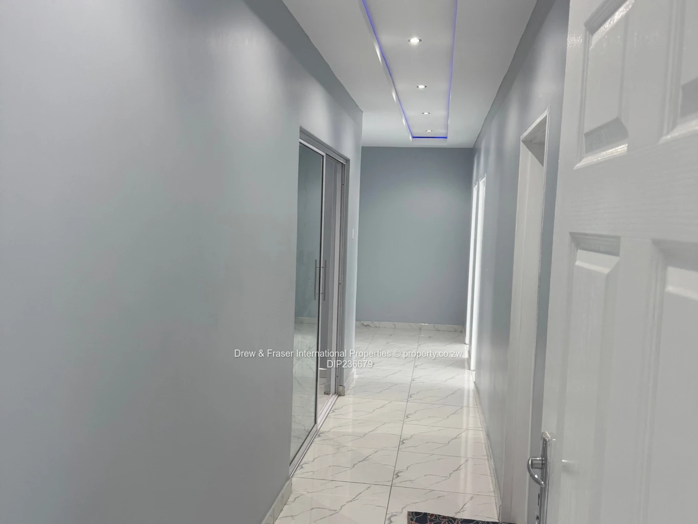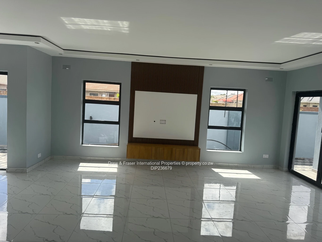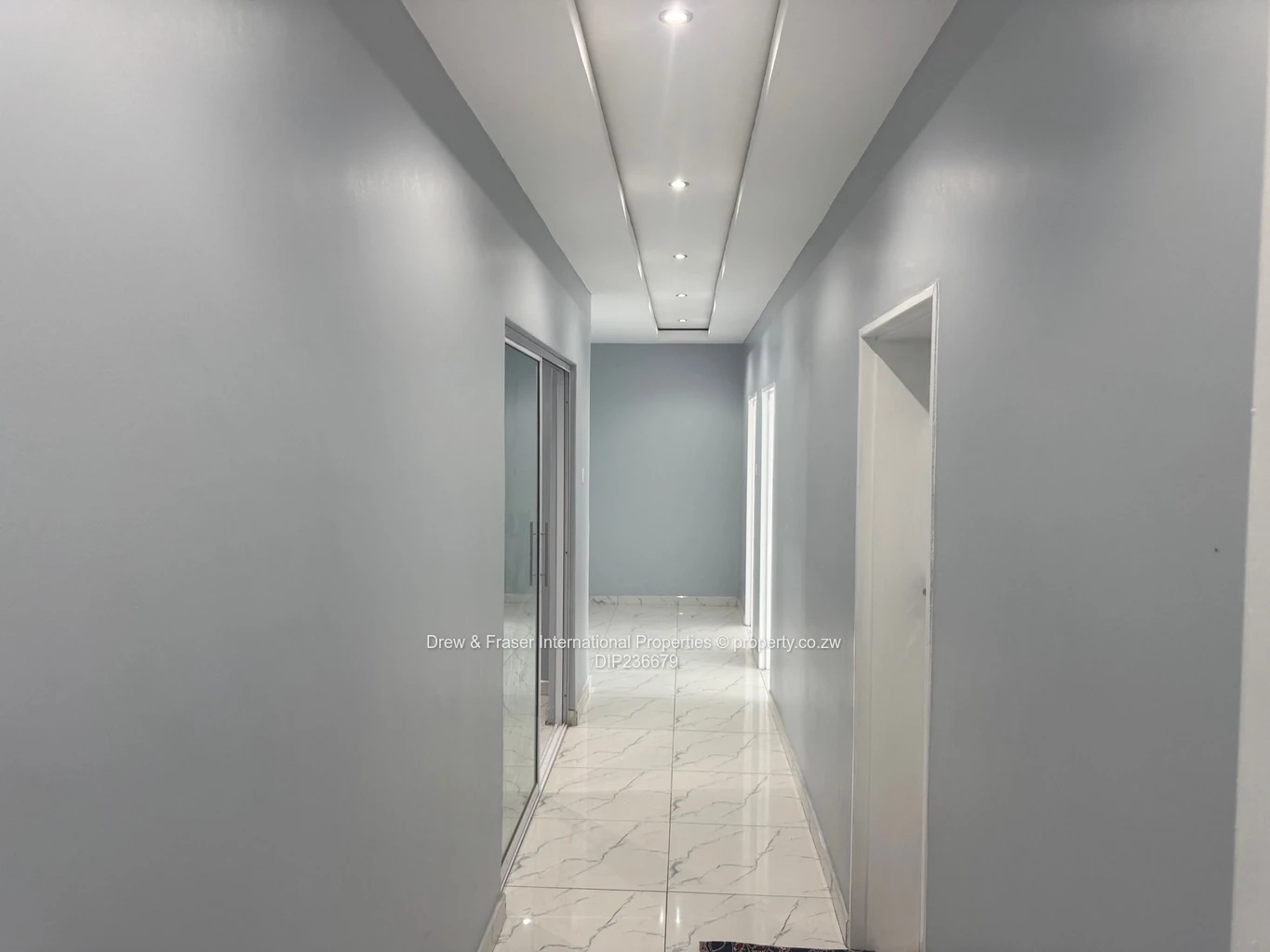 Modern 4-bedroom, 3-bathroom family home for rent in Mabvazuva, Ruwa — built on a secure 600 m² stand with a smart 254 m² footprint. The property greets you with a neat, patterned interlock driveway and double garage/covered parking behind a gated frontage. Inside, bright open-plan living flows onto large sliding glass doors and a covered patio, perfect for indoor–outdoor entertaining. High-quality porcelain tiles and recessed LED ceilings run throughout; the living area features a TV/media recess and abundant natural light.