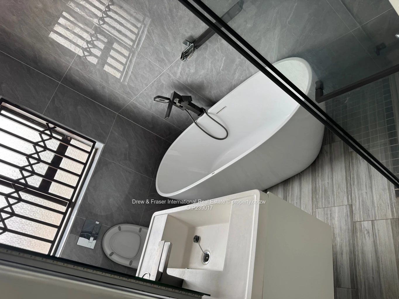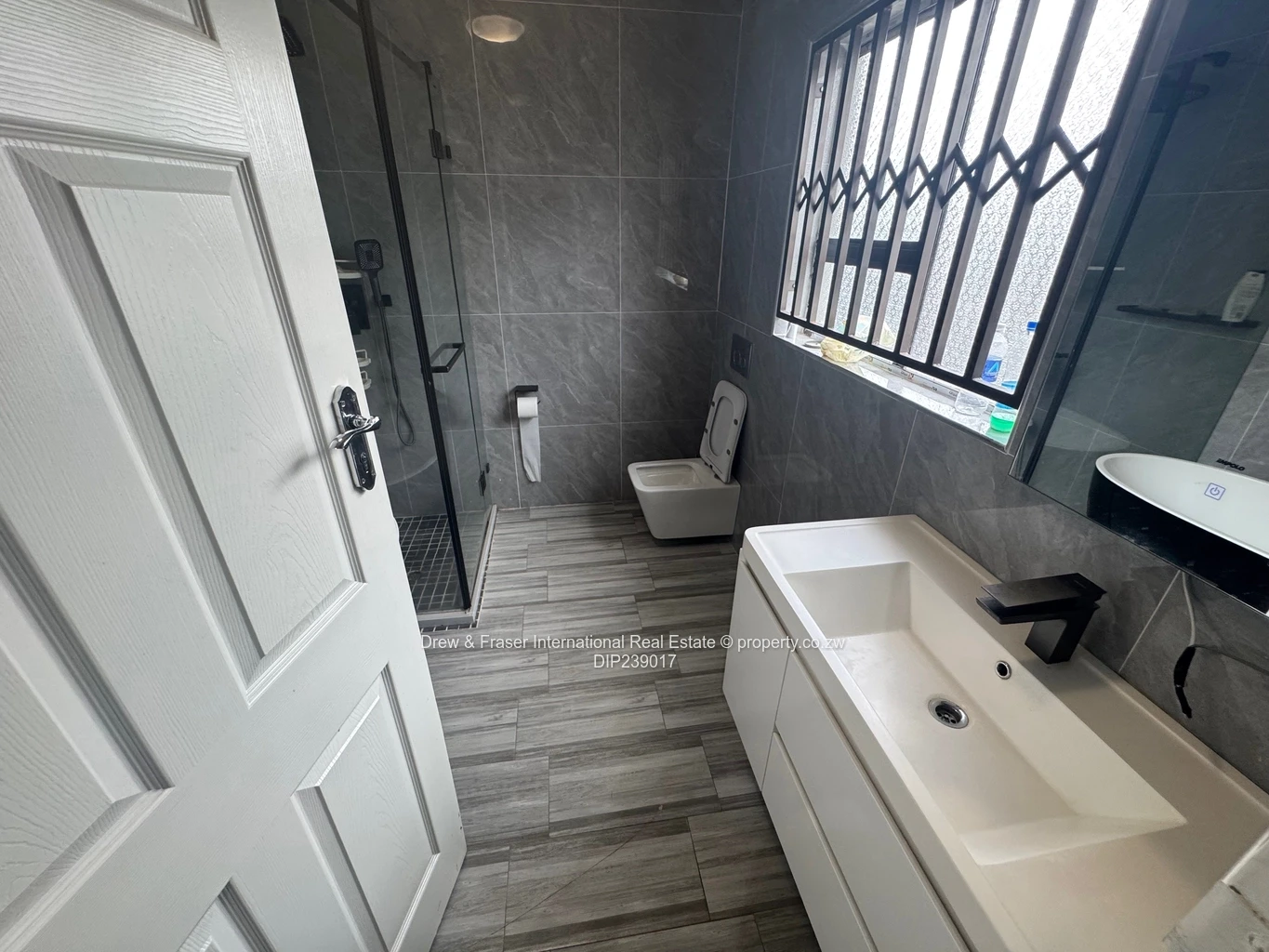 Modern 4-bedroom, 3-bath family home for rent in Mabvazuva, Ruwa — on a neat 400 m² stand with 214 m² of stylish living space. This contemporary property features a sleek open-plan kitchen with stone-effect tiles, built-in oven and hob, breakfast island and pendant lighting, a spacious lounge with feature entertainment wall and vertical blinds. The bedrooms are generous with large built-in wardrobes and the bathrooms are fully tiled in a contemporary grey palette — the master ensuite includes both a walk-in shower and freestanding bath.