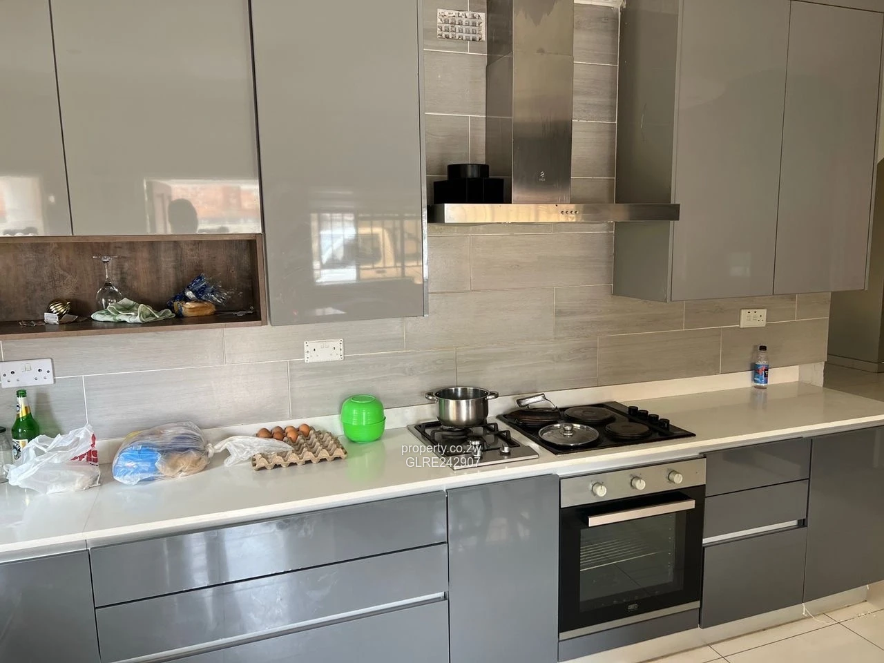Spacious 4-bedroom, 2-bath family home for rent in desirable Waterfalls, Harare South — set on a generous 900 m² stand with 400 m² of living space. The bright exterior (see photo) features a tiled red roof, wide interlocking brick driveway with room for several vehicles and a neat lawn edged with palms and mature shrubs. Inside you’ll find a contemporary tiled interior and a formal dining area under a feature ceiling (photo), plus a sleek modern kitchen with glossy grey cabinetry, double sink, built-in oven, gas hob and extractor hood (photo). The property includes a separate outbuilding/flatlet and practical outdoor laundry sinks and service area (photos). Reliable water supply is assured by an on-site borehole; solar water heating and storage tanks are visible on the roofs. Securely walled, low-maintenance grounds, abundant parking and flexible accommodation make this ideal for families or professionals. Call to arrange a viewing.