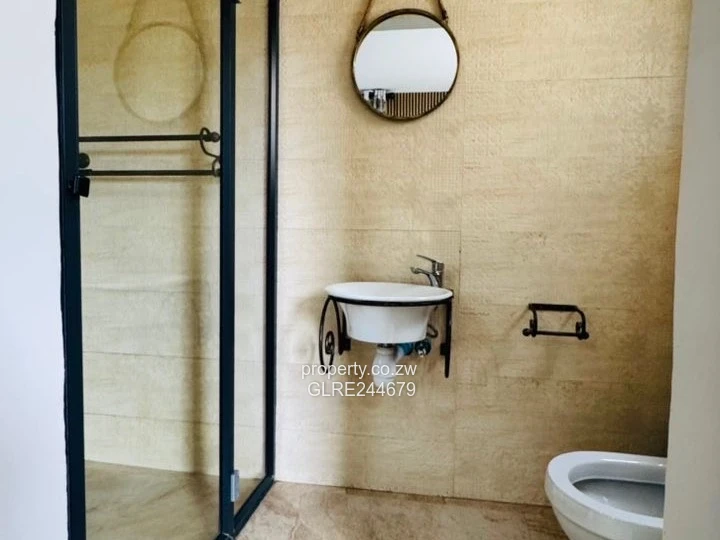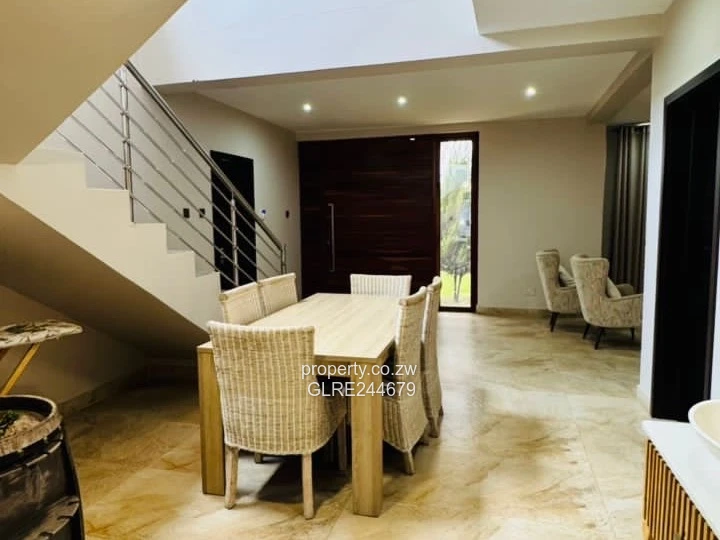 Stunning modern family home for rent in Highlands, Harare North — a bright, fully furnished 4-bedroom, 2-bath residence set on an 800 m² stand with 400 m² of living space. Situated in a secure, landscaped compound, the property features contemporary architecture with large glass windows and balconies (stainless-steel railings visible), paved driveway parking and neat lawns framed by palms and mature trees. Interior highlights include generous bedroom space, a luxurious walk-in closet/wardrobe area, polished tiled floors and tasteful lighting (attractive pendant lights on the stairwell). Practical comforts include a reliable borehole and visible solar water heating on the roofs for energy efficiency. Ideal for professionals or a family seeking modern finishes, convenience and private outdoor space in Highlands. Contact now to arrange a viewing.