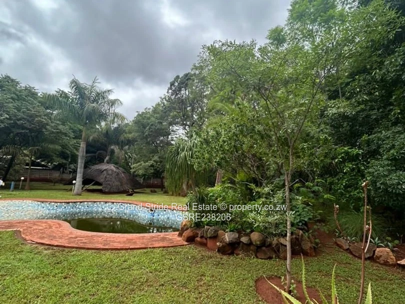 - Large swimming pool, unique sunken gazebo, and a tranquil water feature.