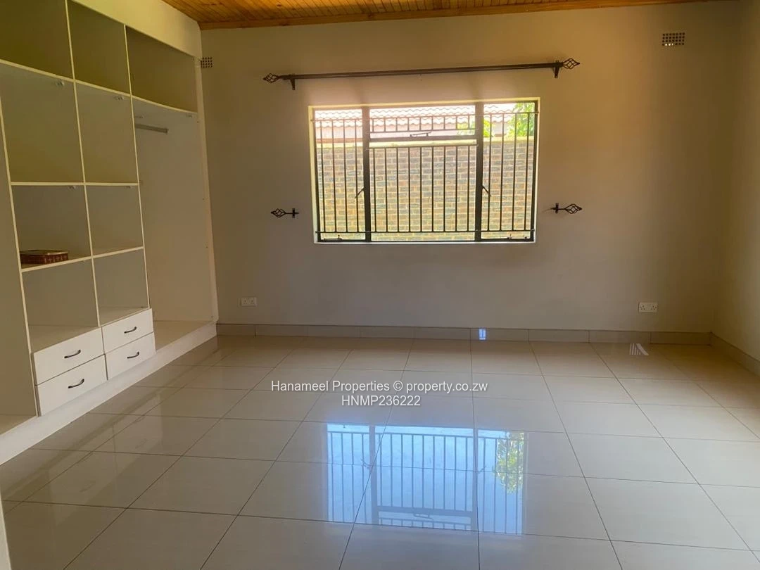 A beautiful modern house to Rent coming with 5 beds Main ensuite, dinning lounge and modern fitted Kitchen double Lock garage, borehole, solar backup and electric fence to be installed. And an 3 beds cottage on the back. The tenant occupying the main house shall the right to sublet the 3 beds cottage. The property is stragical located close to Old Mazoe Rd, round about and Westgate shopping mail