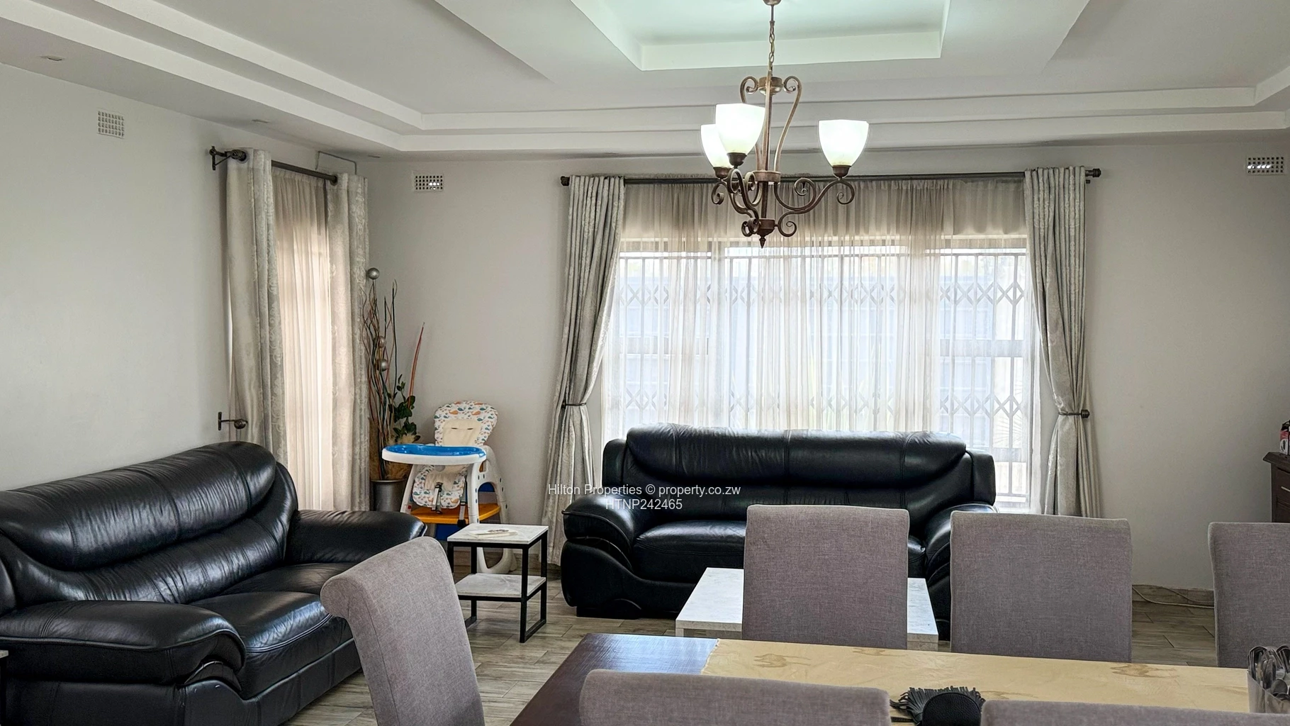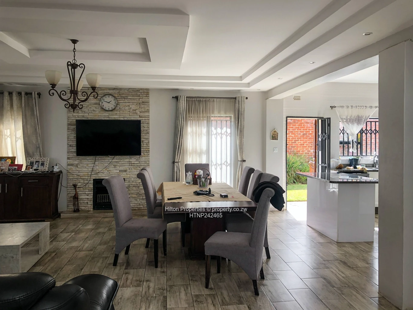 Inside, an open-plan living and dining area features stylish wood-look tiles, a stone-clad fireplace wall and direct access to the kitchen, creating a comfortable flow for everyday living. A double-volume entrance with chandelier and stainless-steel balustrade gives the home a modern, elegant feel. The living room has generous natural light through large windows fitted with curtains and security grilles, plus a secure gated driveway accessible from the hallway.