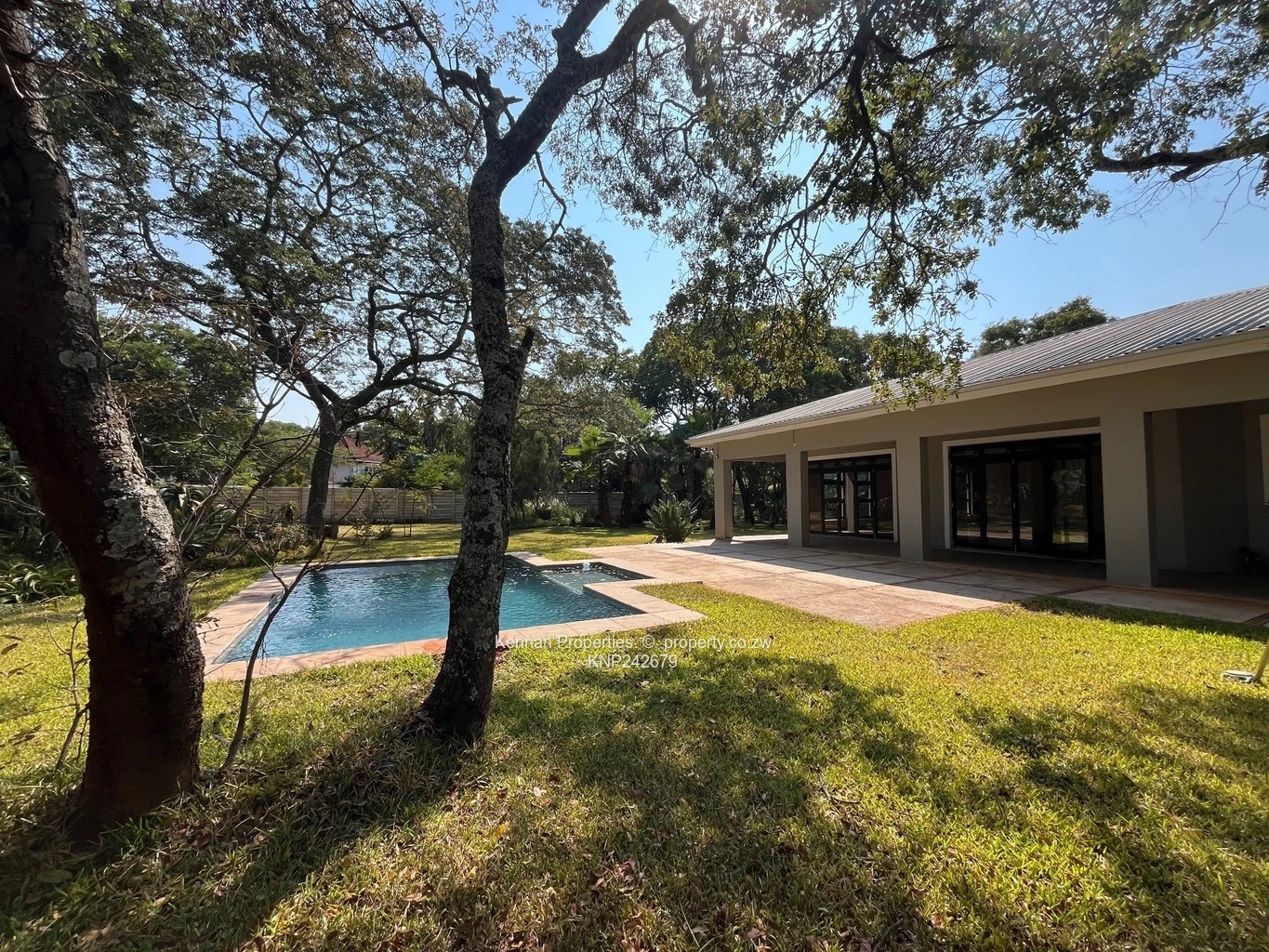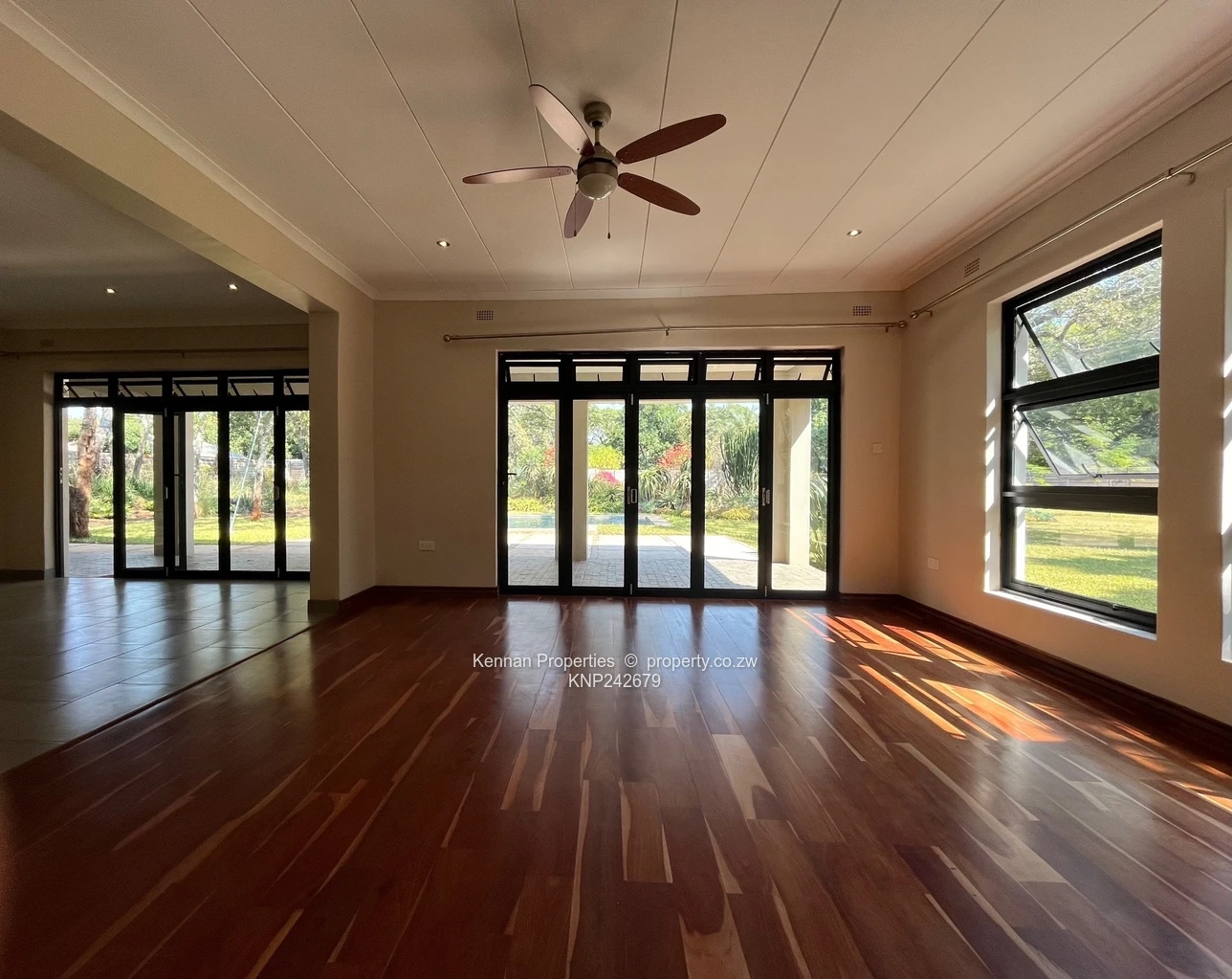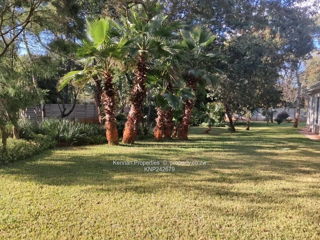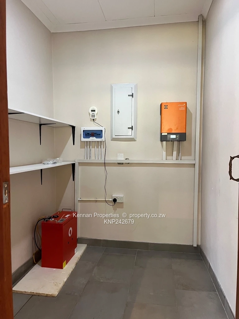 Lovely modern 3 bedroomed home set among msasa trees on a quiet road. Modern built-in kitchen with a separate scullery area, leads onto an open plan dining room area and lounge with teak floors. Second lounge with teak floors. 3 good sized bedrooms, MES, and a guest bathroom. Lovely light throughout the house. Veranda and entertainment area overlooks a pool and an established landscaped garden. 5KVA solar (batteries excluded) plus 5KVA back up generator. Fully walled and with electric fence and electric gate. One room staff quarters. Double carport. Excellent borehole. Previous tenant was an embassy employee.