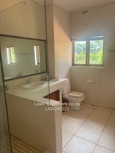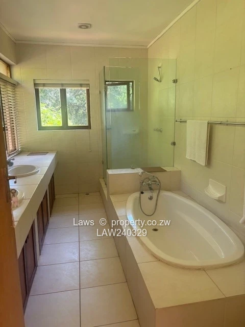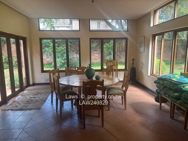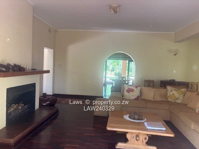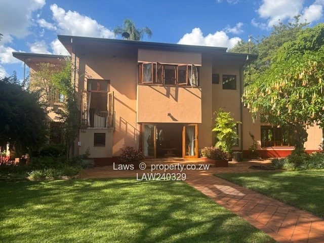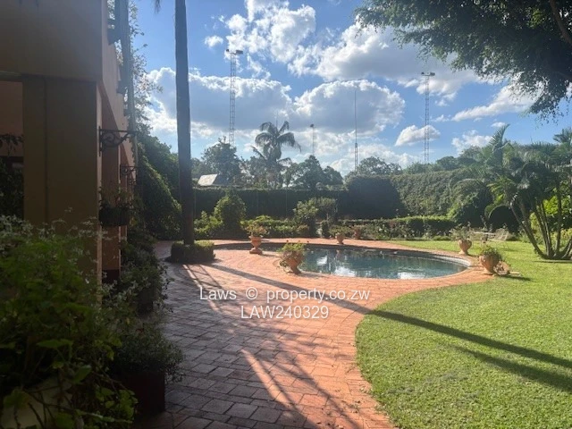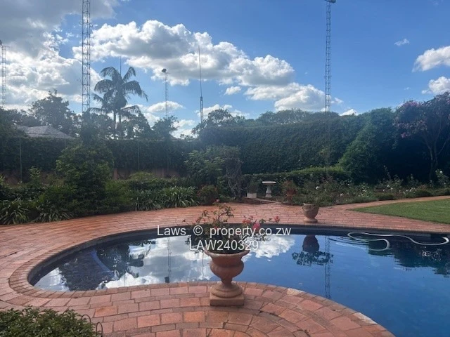 Downie Avenue. Old Glory double story property with unique atmosphere on 1,5 acres with lavish gardens grounds and views overlooking the golf course, swimming pool and prolific borehole. Comprising 4 bedrooms, (2 en suite) with huge balconies suitable for entertainment some overlooking the golf course, third family bathroom, 3 lounges with 3 fire places, (one on the verandah), dining room, office, lovely kitchen, full on solar, 30 KV generator, fully alarmed and secured with guard room, staff accommodation 5 rooms, suitable for a private residence or company head office. Rent per month USD 3000 (rates paid by the owner). Furniture optional. Available immediately.