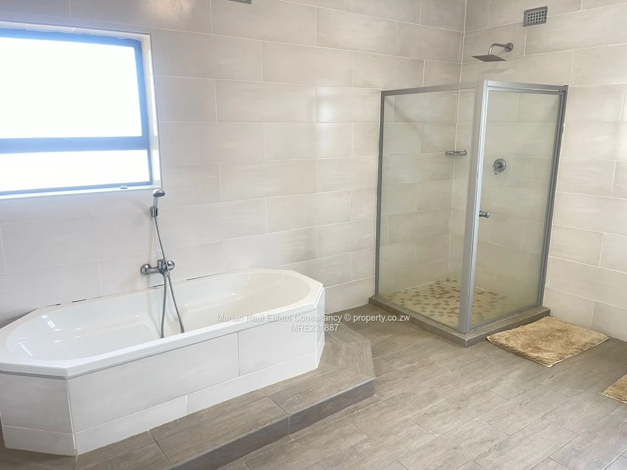 Lovely fully furnished property for rental, suitable for corporate or Air BnB purposes, the property boasts five en-suite bedrooms, an office and a linen room that can be utilized as bedrooms, guest rest room, two sitting rooms, a dining room and a fitted kitchen, incomplete pantry and scullery and a double garage. Outside is a self contained double worker’s quarters and two 5000l water tanks equipped with a booster pump, walled and gated…in Selbourne Brooke @ $1000/month