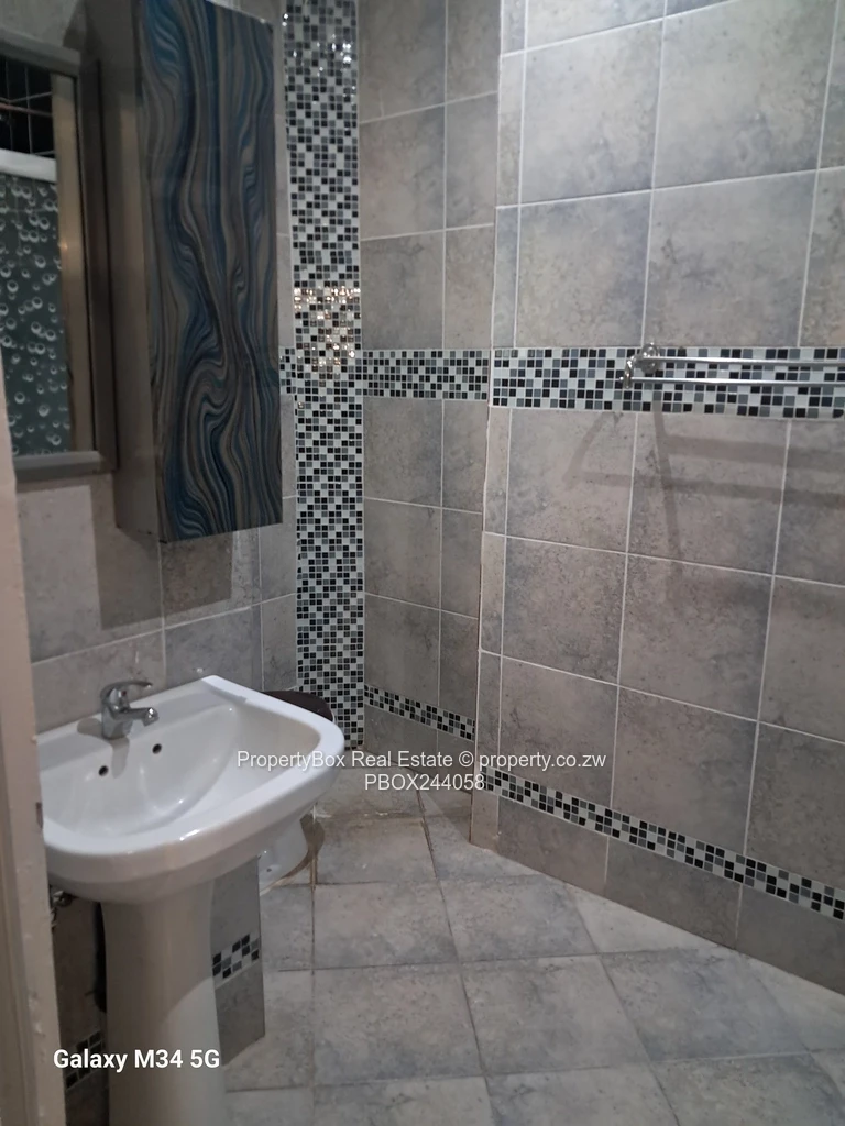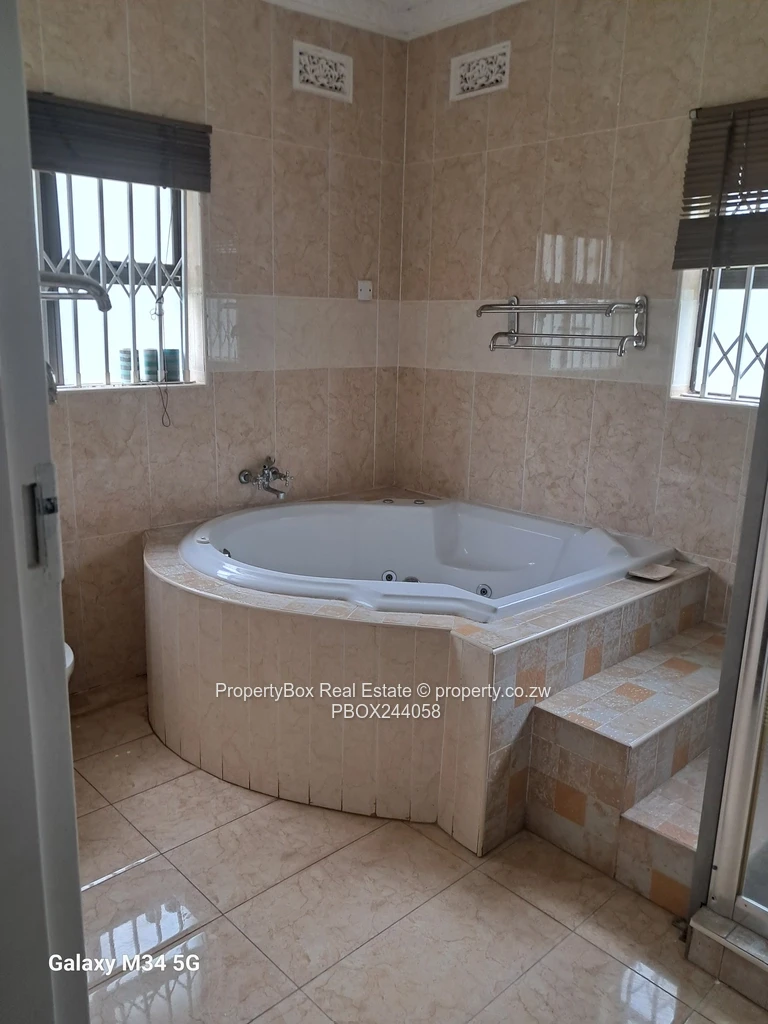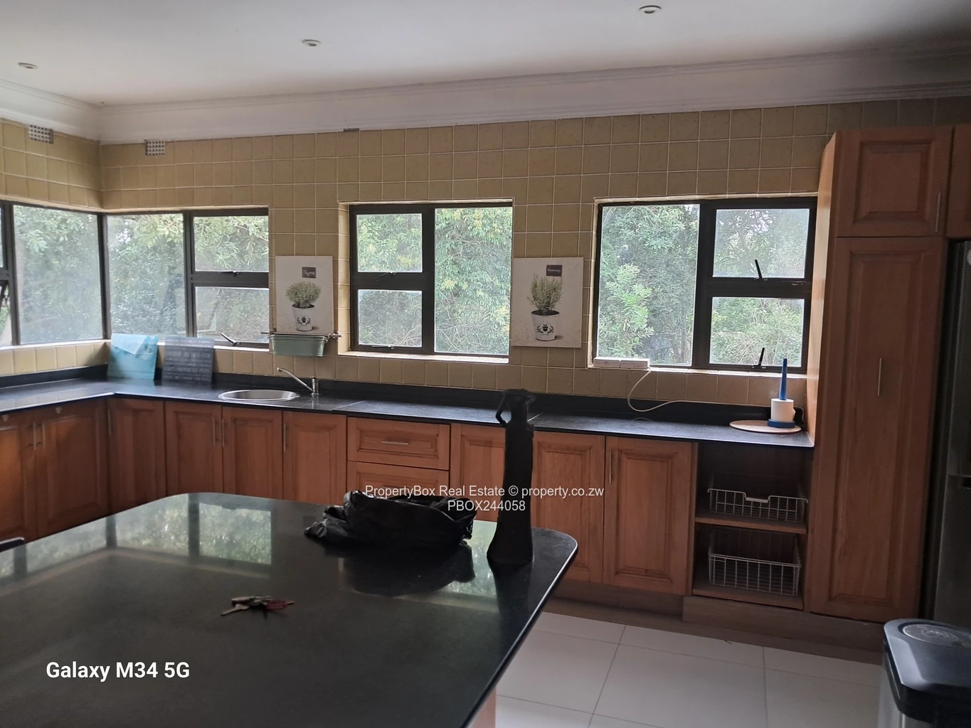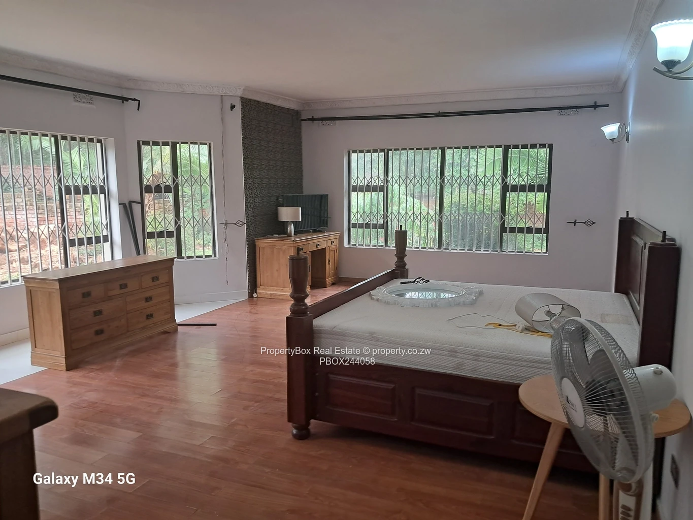 PropertyBox Real Estate is pleased put on offer this fully furnished property for immediate occupation. Its features are as follows: Double lockup garage and the ground floor and a basement spacious bedroom with own toilet and bath, First floor comes with a 4 bedrooms with built-in cupboards and own ensuites, beds in all bedrooms, lounge with set of kirsty leather lounge suite and an ovelooking balcony for fresh air, dining with dinings suite chairs, fitted kitchen with a gas stove, kitchen nuke, pantry, 5kv solar back up system, Zol Wi-fi internet connection, guest toilet, Master bed with a bed, dressing closet and ensuite, prolific borehole connected to 3 x 10 000litre water tank and a 5000l water tank, solar geyser 150l, electric geyser, paved driveway, electric fence, well manicured yard, laundry room, shared swimming pool, zesa, electric gated with an intercom, walled, veranda. This property is fully furnished. Contact us today!