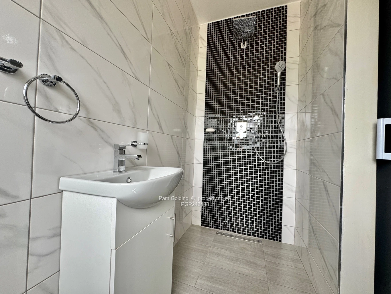 This beautifully appointed home welcomes you with a study nook in the entrance hall, leading into a spacious modern kitchen complete with a separate scullery and pantry. A private guest wing is situated at the end of the passage, featuring an en-suite bathroom.