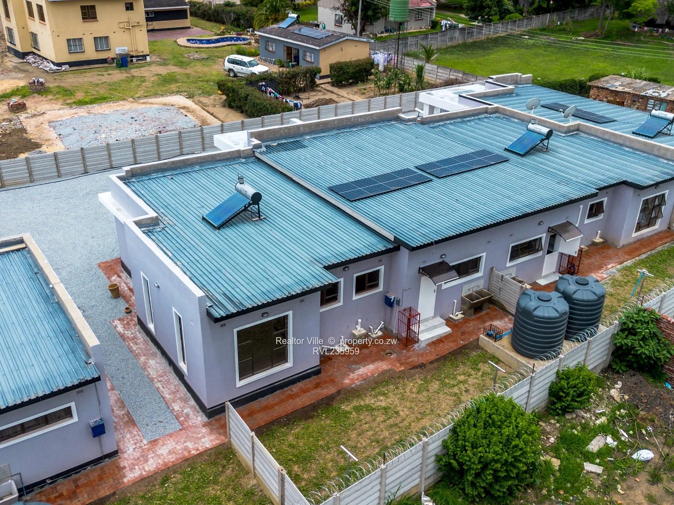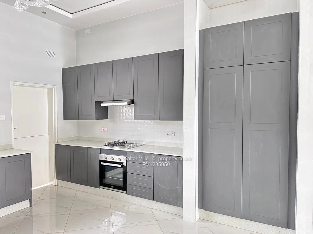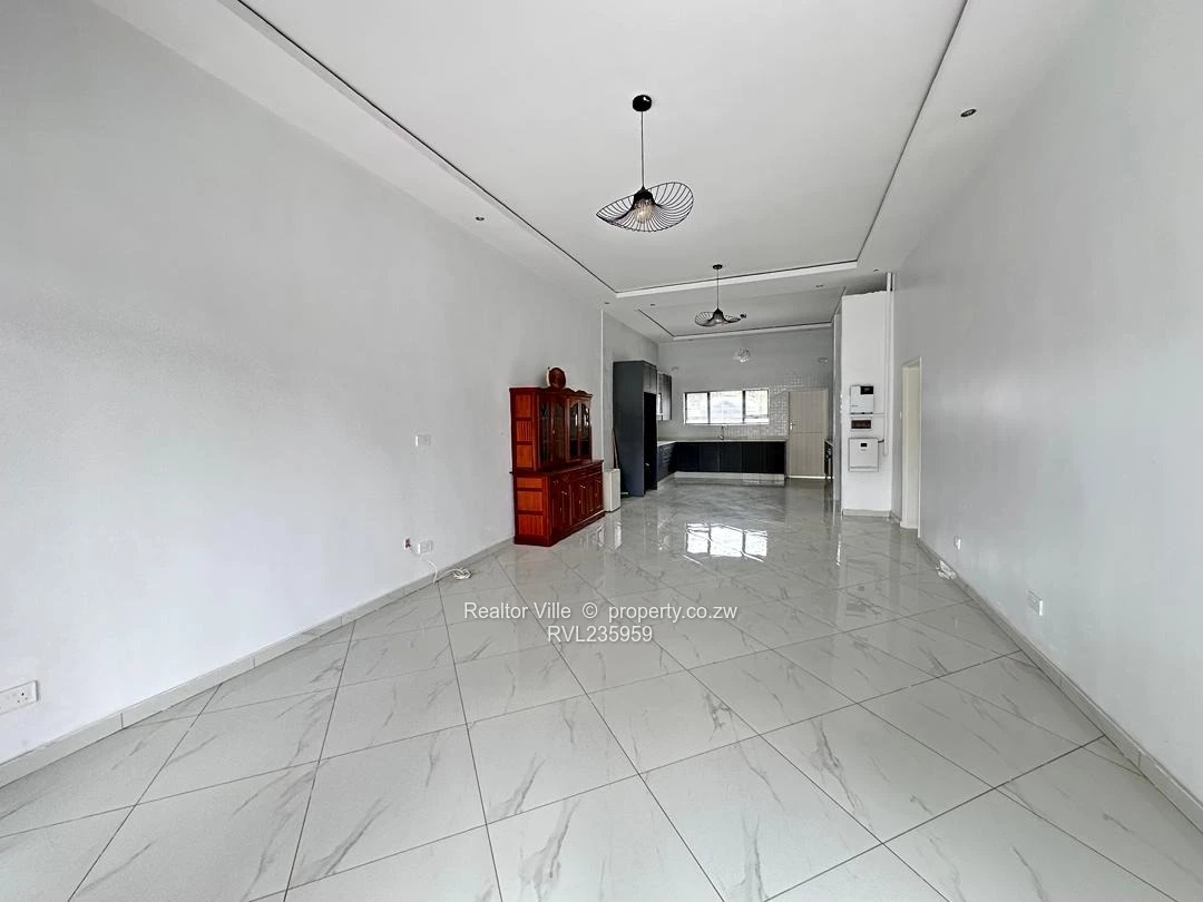 Modern 3-bedroom, 2-bathroom house for rent in The Grange, Harare North — stylish, secure and move-in ready. The freshly painted exterior (soft grey with white trim) and covered entrance with decorative vertical slats make an immediate impression; a large gravel forecourt provides ample parking. Inside you’ll find bright, open-plan living and dining areas with high recessed ceilings, contemporary pendant lighting and glossy marble-effect floor tiles that flow through the home. The sleek fitted kitchen features dark-grey cabinetry, generous bench space and an integrated oven and gas hob. The master suite includes built-in storage and a walk-in closet area with frosted sliding door, while the second and third bedrooms are well-proportioned with built-in cupboards. Both bathrooms are modernly tiled and finished. Practical extras visible on-site include a borehole with water tanks, a secure perimeter wall topped with security features and small, easy-to-maintain lawn areas. Land area 250 m² | Building area 5,000 m². Ideal for professionals or a family seeking contemporary comfort, reliability and low-maintenance grounds. Contact now to arrange a viewing.