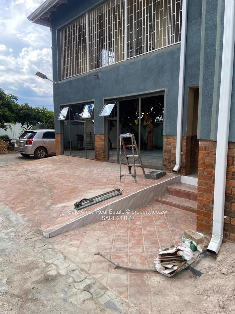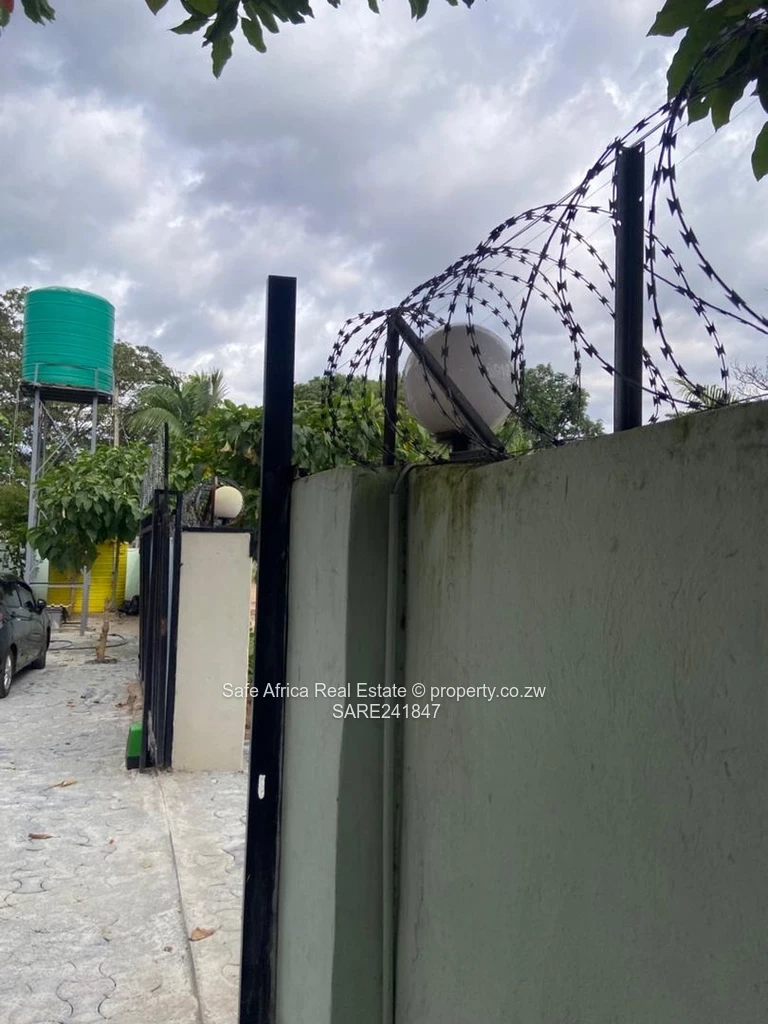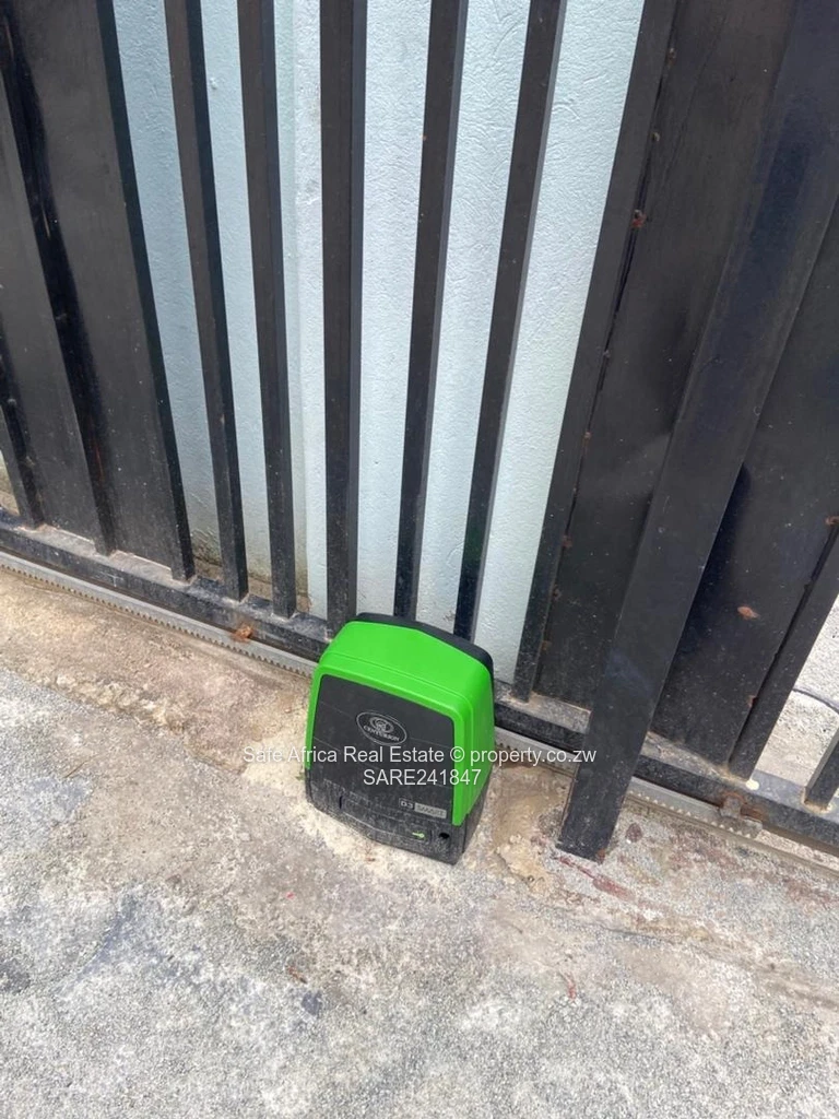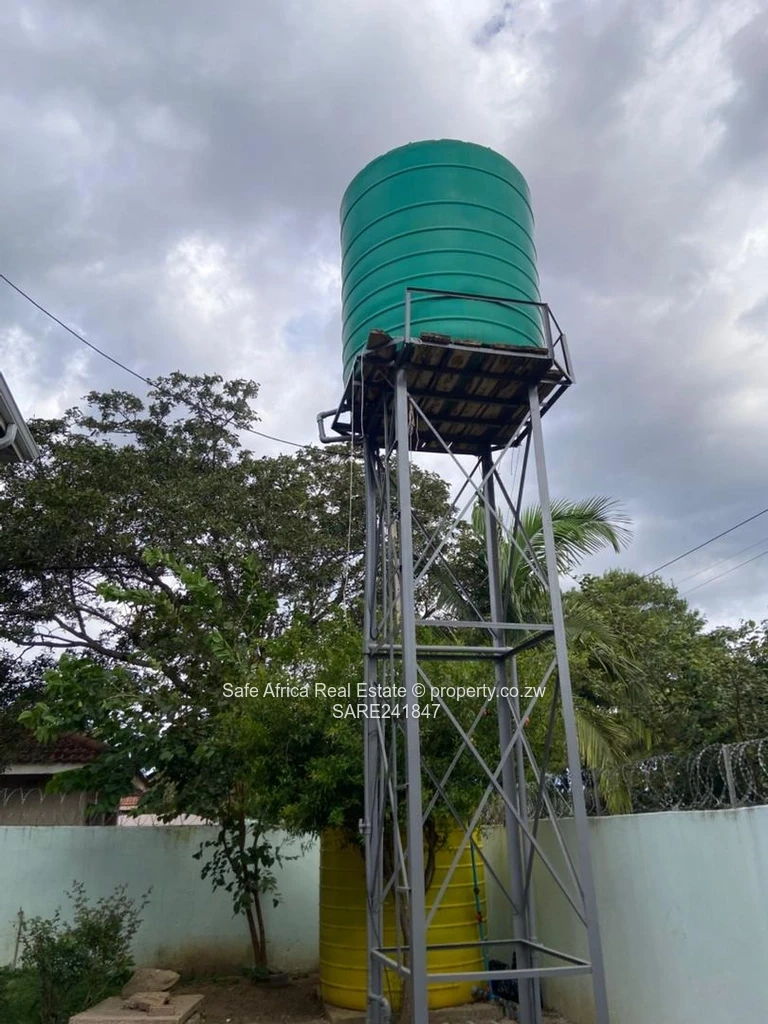 The property is powered by a 5kVA solar system with lithium batteries, two solar geysers, borehole water supply, and council sewer connection. Additional features include two 5000L water tanks (one currently leaking), booster pump, electric cottage with its own meter, and TelOne WiFi connection.