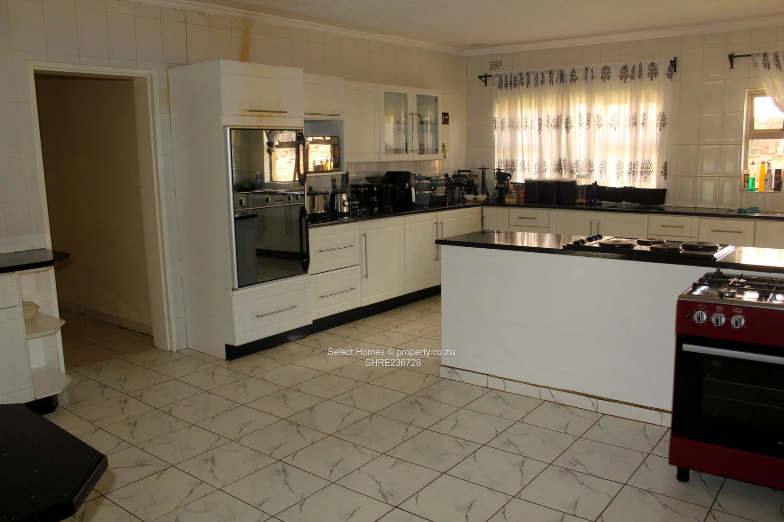 * *Modern fitted kitchen* with *built-in cupboards (BICs)*, a *kitchen island*, tiled finishes, and a neat *pantry*