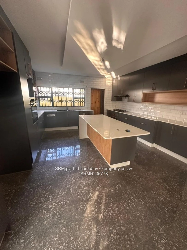 Inside, bright open living spaces feature modern false ceilings and large sliding doors with security gates that flood rooms with natural light. The formal lounge shows a stylish TV feature wall and highly polished floors, while the kitchen is a chef’s delight — extensive cabinetry, an island breakfast counter, built-in hob and extractor, quartz/granite surfaces and plenty of workspace and storage (see kitchen images). A secondary prep kitchenette and laundry area add convenience.