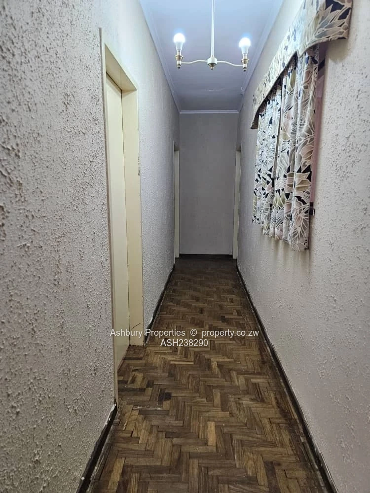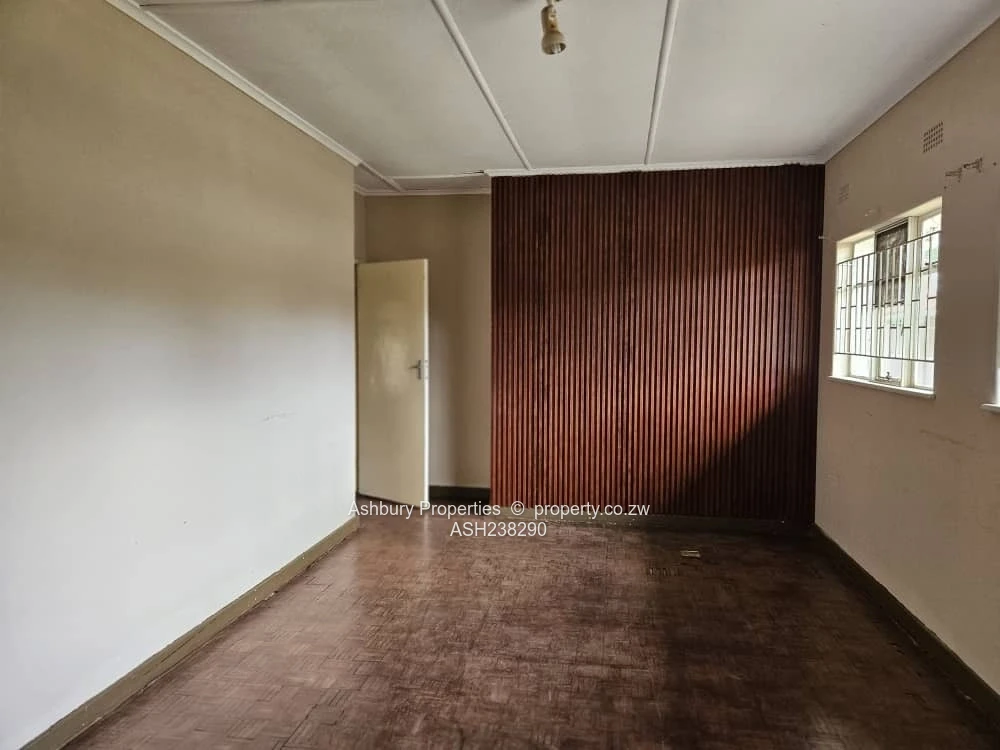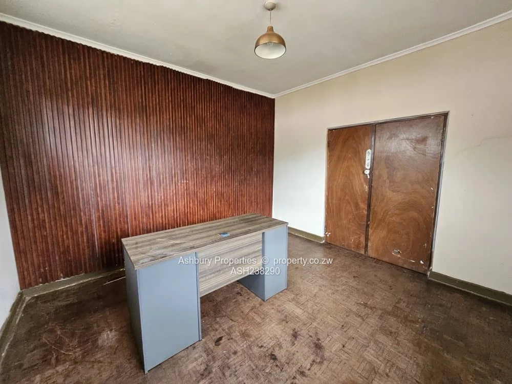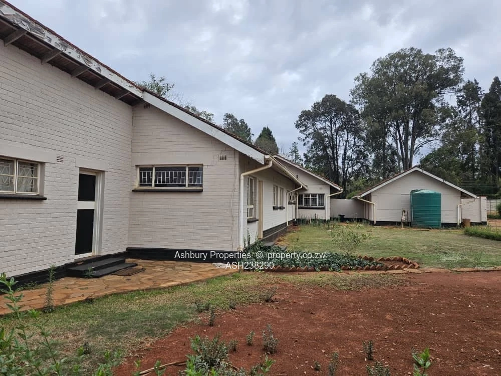 Prime office for rent in Mount Pleasant, Harare North — a single-storey, character-rich property set on a generous 4,000 m² stand with approximately 300 m² of usable office space. As seen in the photos, the building presents a long bungalow-style elevation with tiled roof, secure barred windows and neat plastered exterior finished with contrasting skirting. The wide front and side gardens provide easy on-site parking, clear vehicle access and space for signage or secure staff parking; a separate outbuilding and visible water tank add operational convenience.