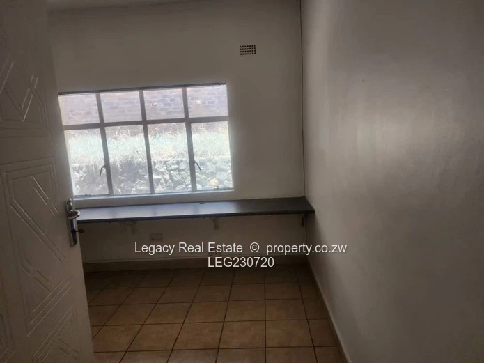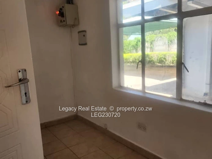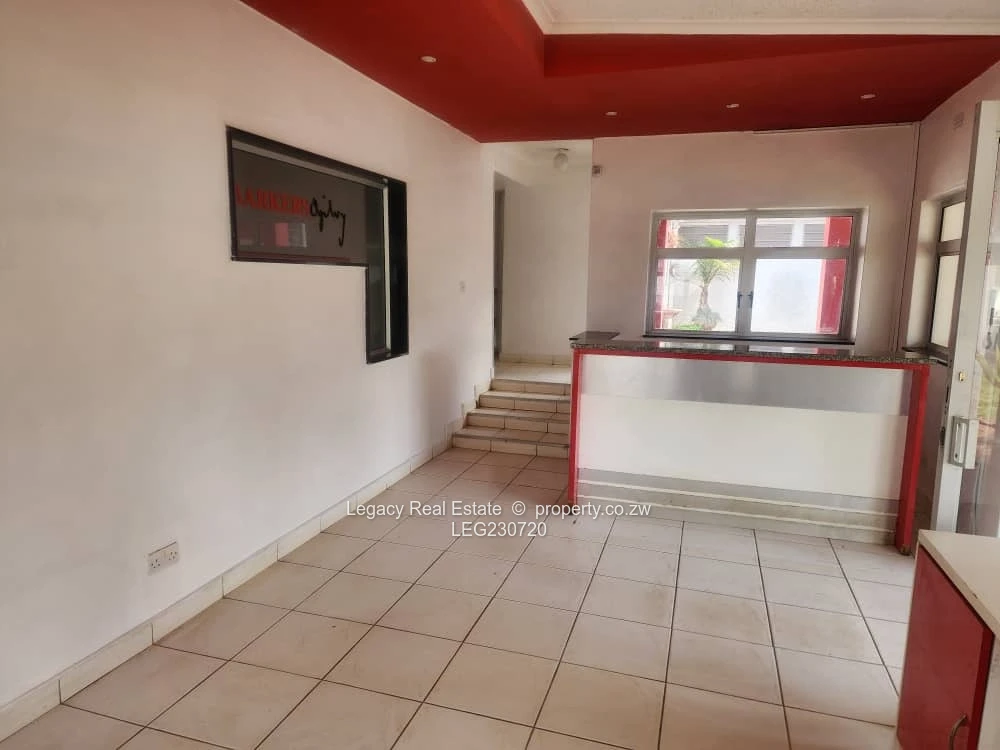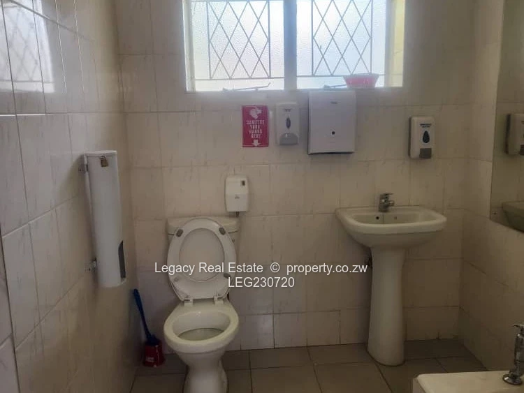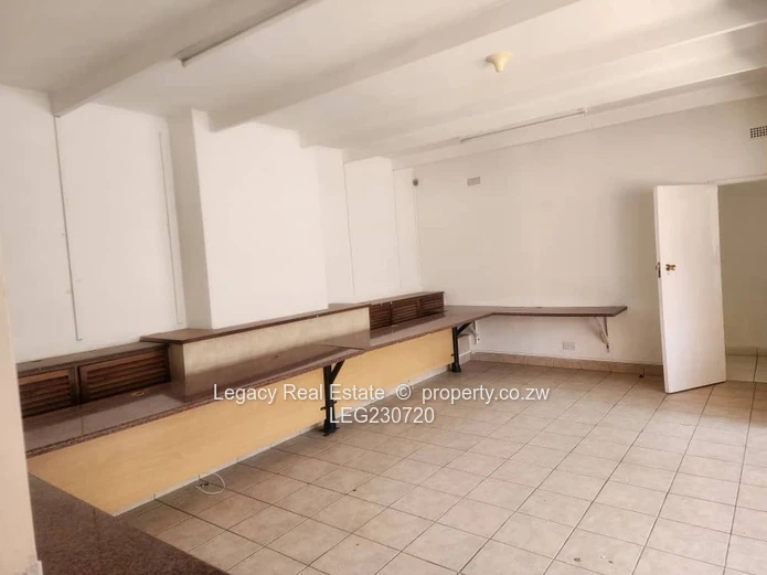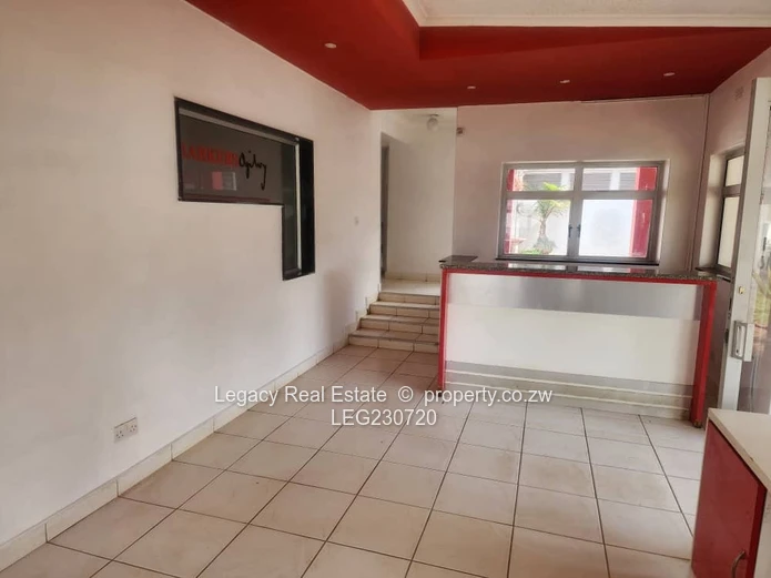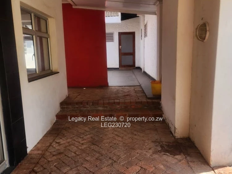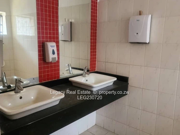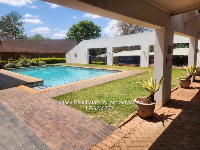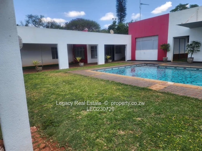 Newlands Offices available for rent at USD 5,000 per month with a deposit of USD 5,000 (admin fee applicable). The property features a reception area, large indoor and outdoor parking, swimming pool, borehole with 5 × 4L water tanks, 15kVA solar backup, ZESA, air conditioning, and is fully walled and gated with a secure entrance and guard rooms. The East Wing comprises 3 offices and an auditorium, while the West Wing offers 14 offices, a boardroom, a large conference room, a kitchen with pantry, a safe room, 2 courtyards, 2 toilets plus 1 with tub and shower. The offices are tiled with paved surroundings, include outdoor toilets, and are conveniently close to amenities.