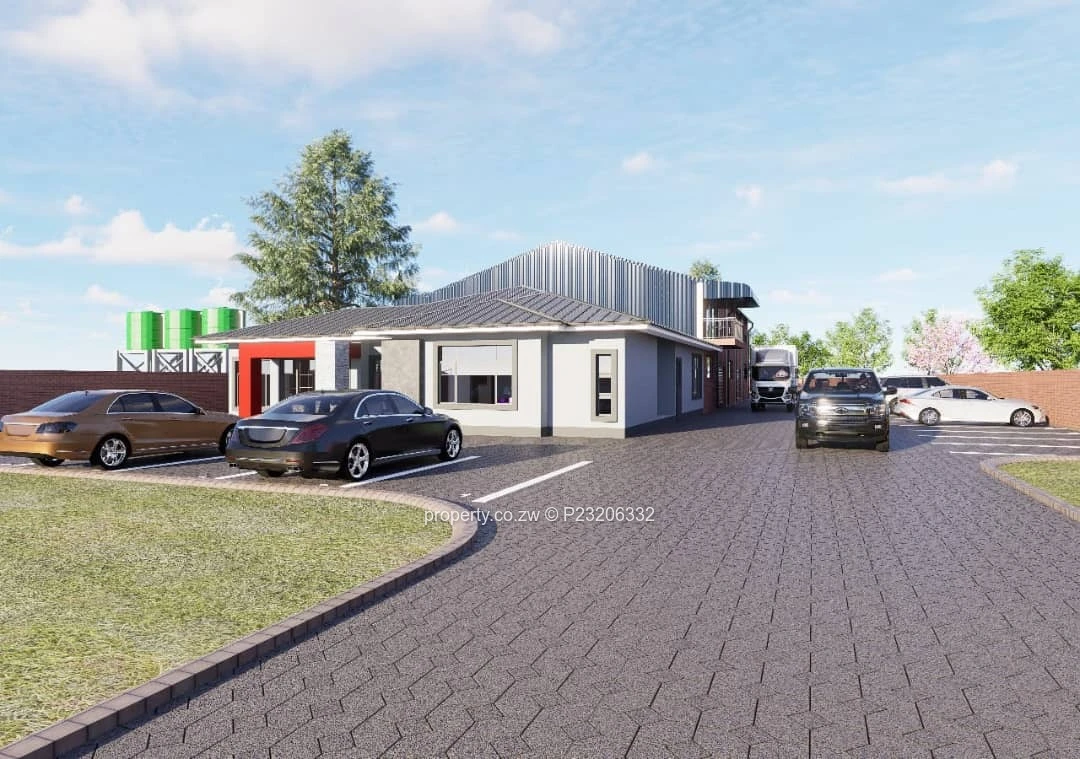Prime office and light-industrial compound coming soon for rent in Airport, Harare South — 6,800 m² of land with 1,350 m² of built space, ideal for head office, distribution or service operations. The property presents a contemporary cluster of single- and double-storey office suites with red-accented entrances and large glazed windows that flood interiors with natural light, together with a substantial brick warehouse featuring high roller shutter doors and dedicated loading space for trucks. The fully paved central courtyard and driveways provide easy vehicle circulation, ample parking bays for staff and visitors, and clear truck manoeuvring areas visible in the images. Mature trees and neat landscaping soften the hardscape around the reception-style canopy and parking forecourt. Essential utilities include an on-site borehole for reliable water supply — a major asset for business continuity. With a versatile layout that blends professional office finishes and practical logistics infrastructure, this secure-looking compound near Harare International Airport offers immediate operational capability and strong street presence. Contact us to arrange a viewing and discuss lease terms.