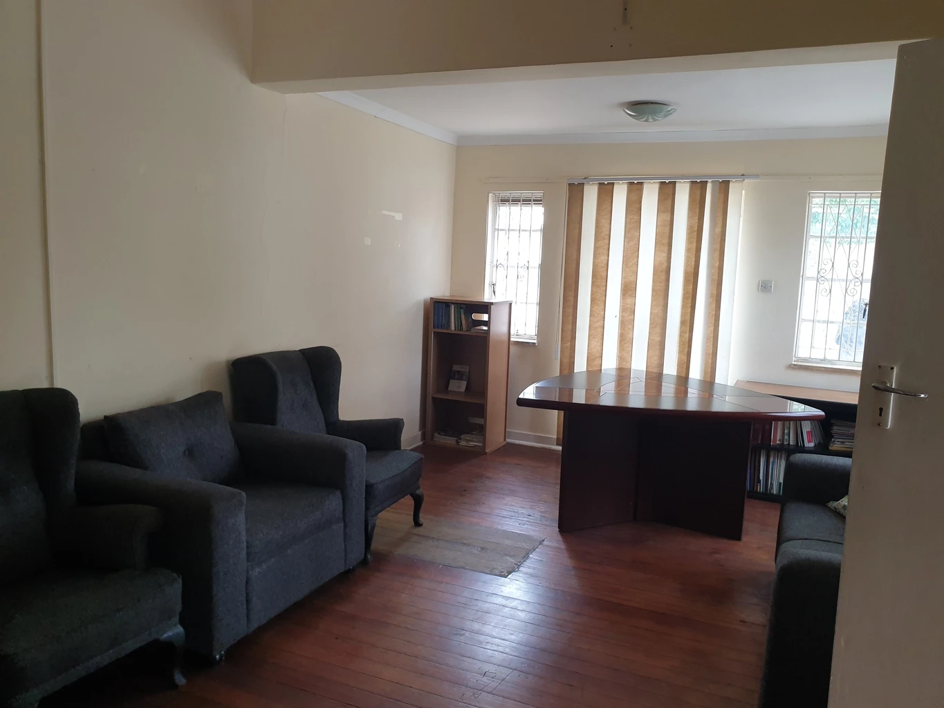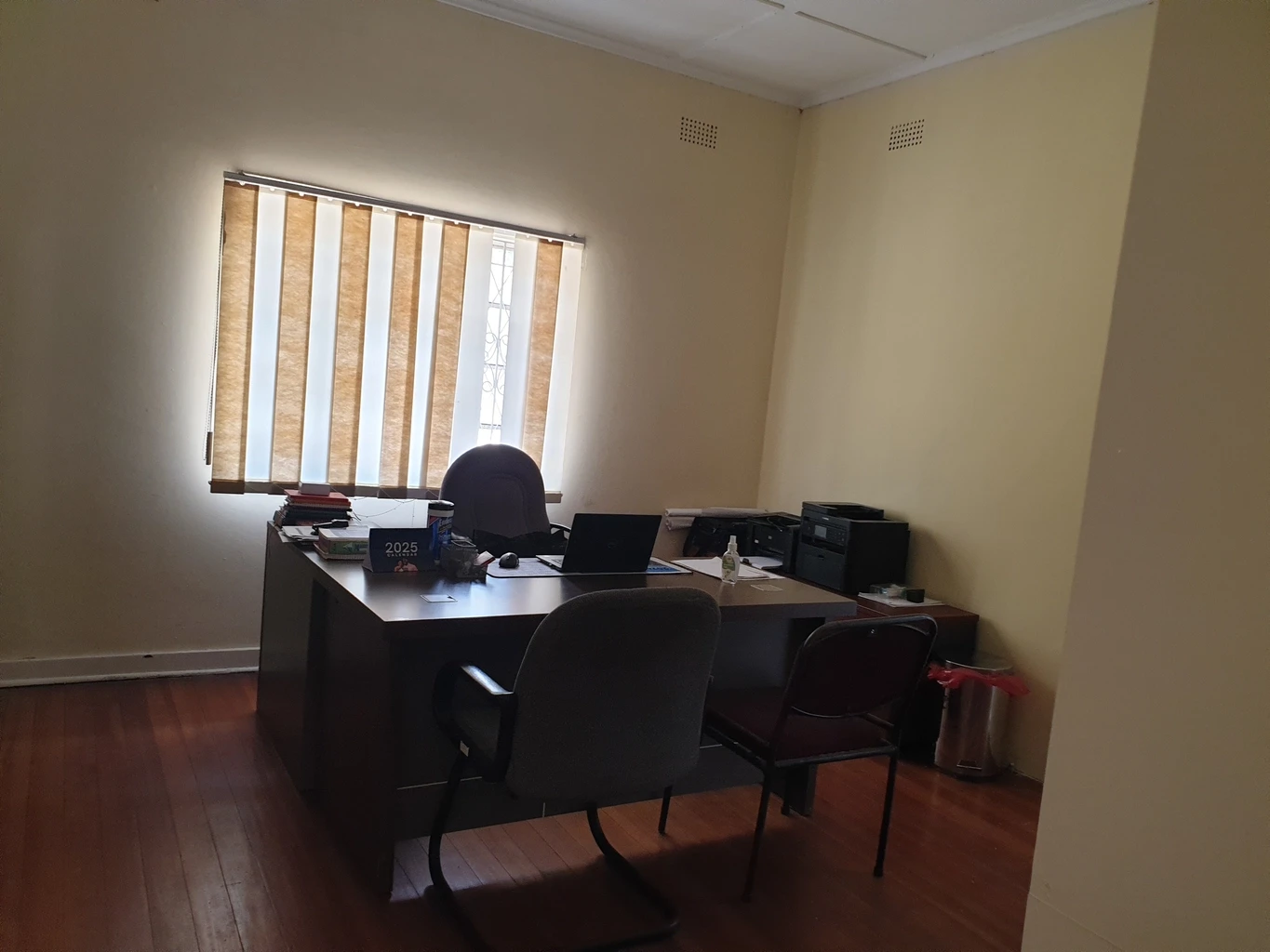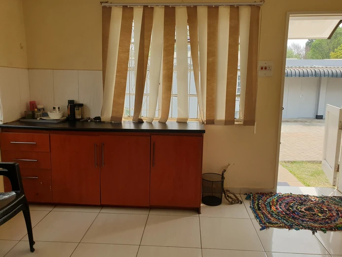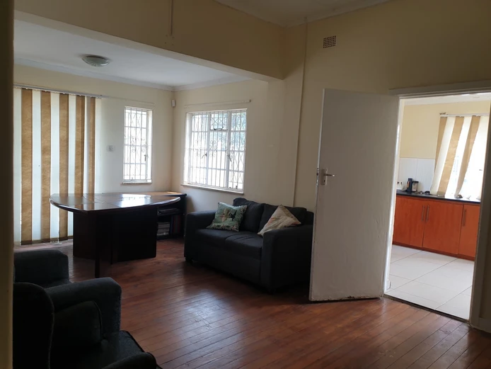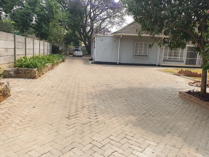 3 spacious offices main with ensuite bathroom, plus modern fitted kitchen, plus 1 outside offices and outside toilet ;borehole water, manicured gardens, inside parking space, walled and gated, close to plenty amenities around. About 150mtrs from.robert Mugabe road ,