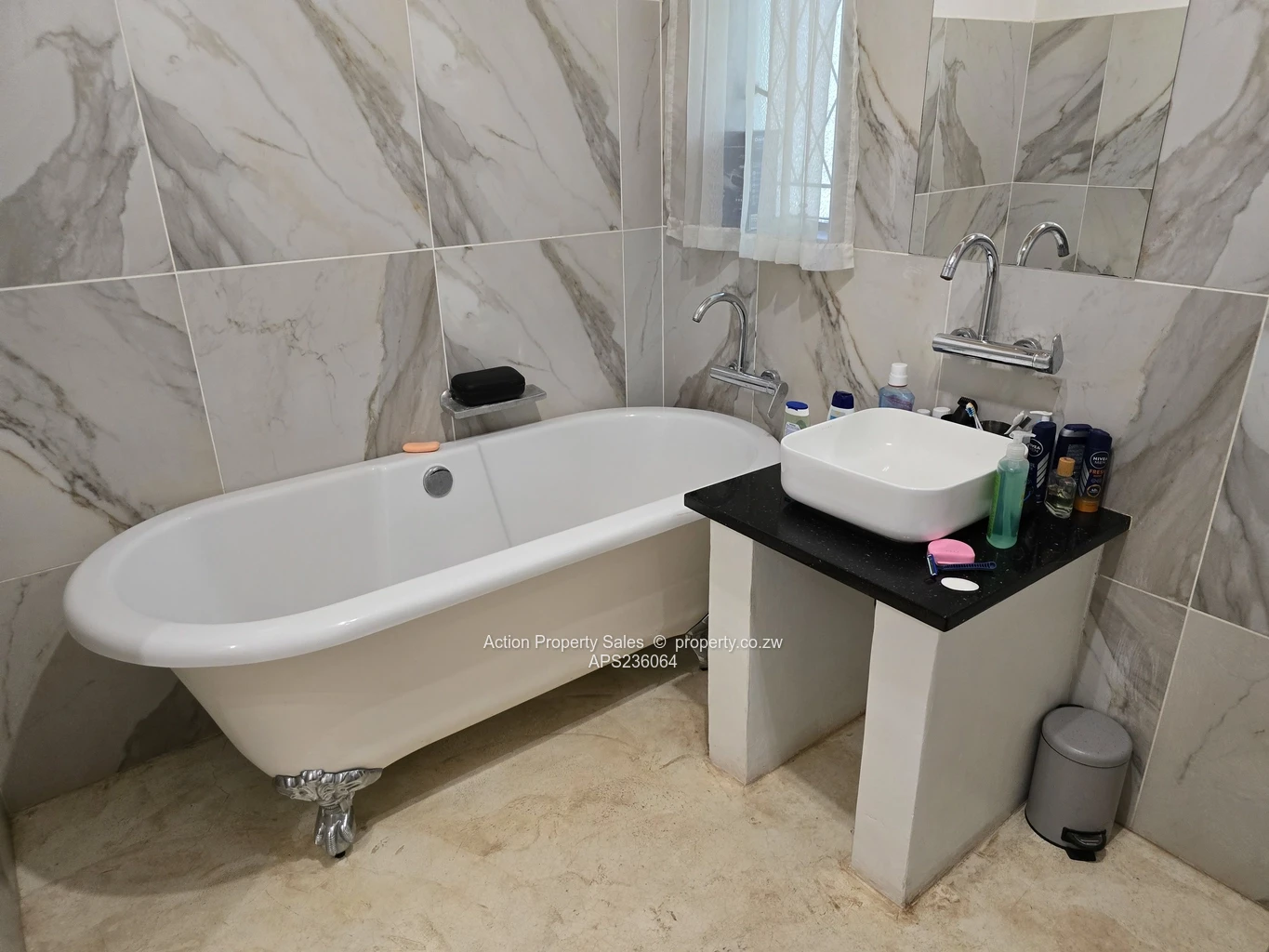 This lovely townhouse for rent in Borrowdale Brooke offers a spacious and inviting living experience. Step into an open plan lounge and dining area that boasts rustic charm with a guest toilet for added convenience. The fitted kitchen features a breakfast nook and separate scullery. Leading out from the kitchen are two separate courtyards. There are three bedrooms, all with built-in cupboards. Next to the bedrooms is a family bathroom with a bath, shower, toilet and sink. The main bedroom has an en-suite bathroom consisting of a bath, shower, toilet and sink.