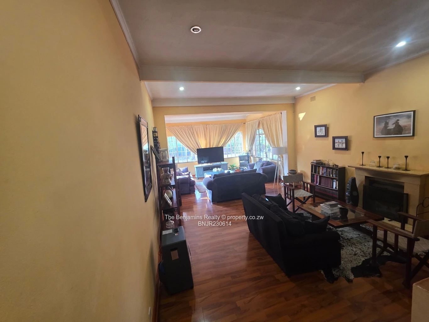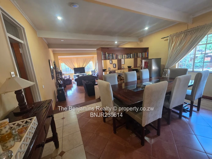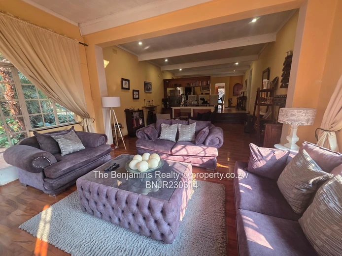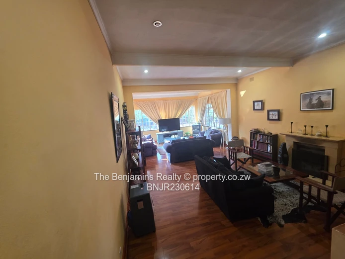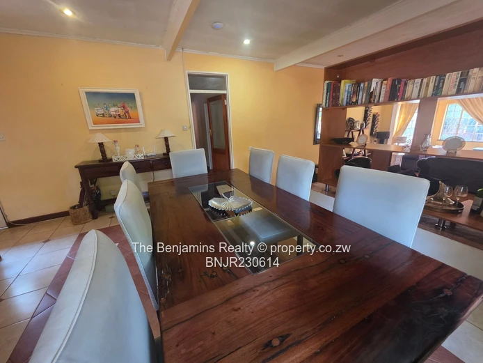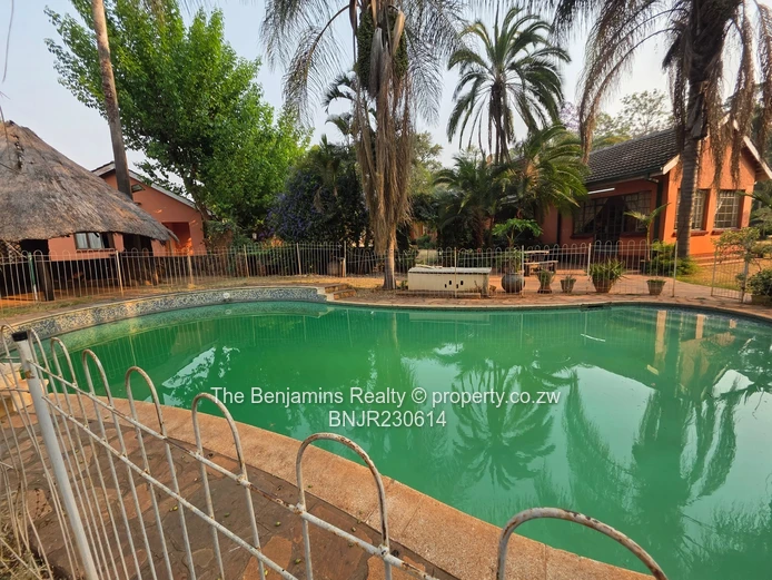 Charming home situated in Greystone Park less than one kilometer away from St John’s School. Turn left in Harare Drive and head for Sam Levy;s Village and turn right and you on track for Chisipite Shops. Spacious home. Well maintained. Seperate dining room with four steps down into the sunken spacious lounge. French doors open onto the pool area. The kitchen is modern with a kitchen breakfast table. This home has four bedrooms The main bedroom has an en suite bathroom and the family bedroom services the other three bedrooms. Enjoy entertaining in the gazebo over looking the swimming. Double lock up garages. Storeroom, laundry. Staff quarters for two. Tennis court. Brick drive with ample parking. Borehole and solar. Walled and gated and electric fence
