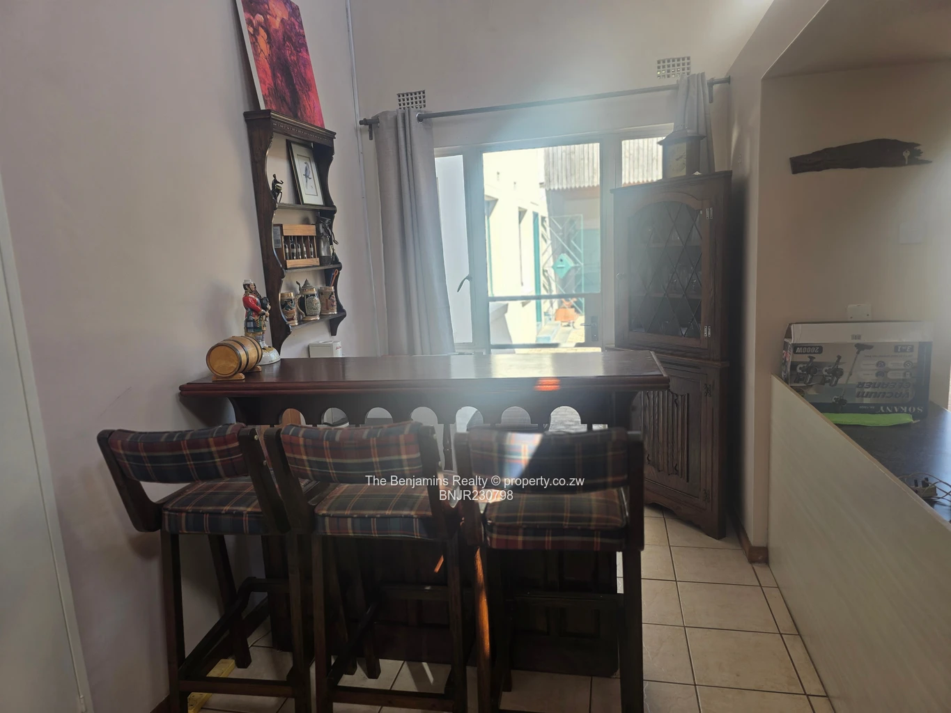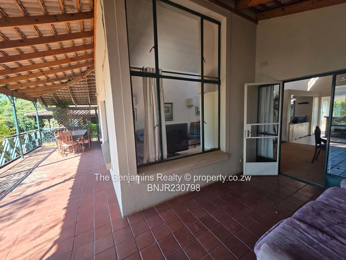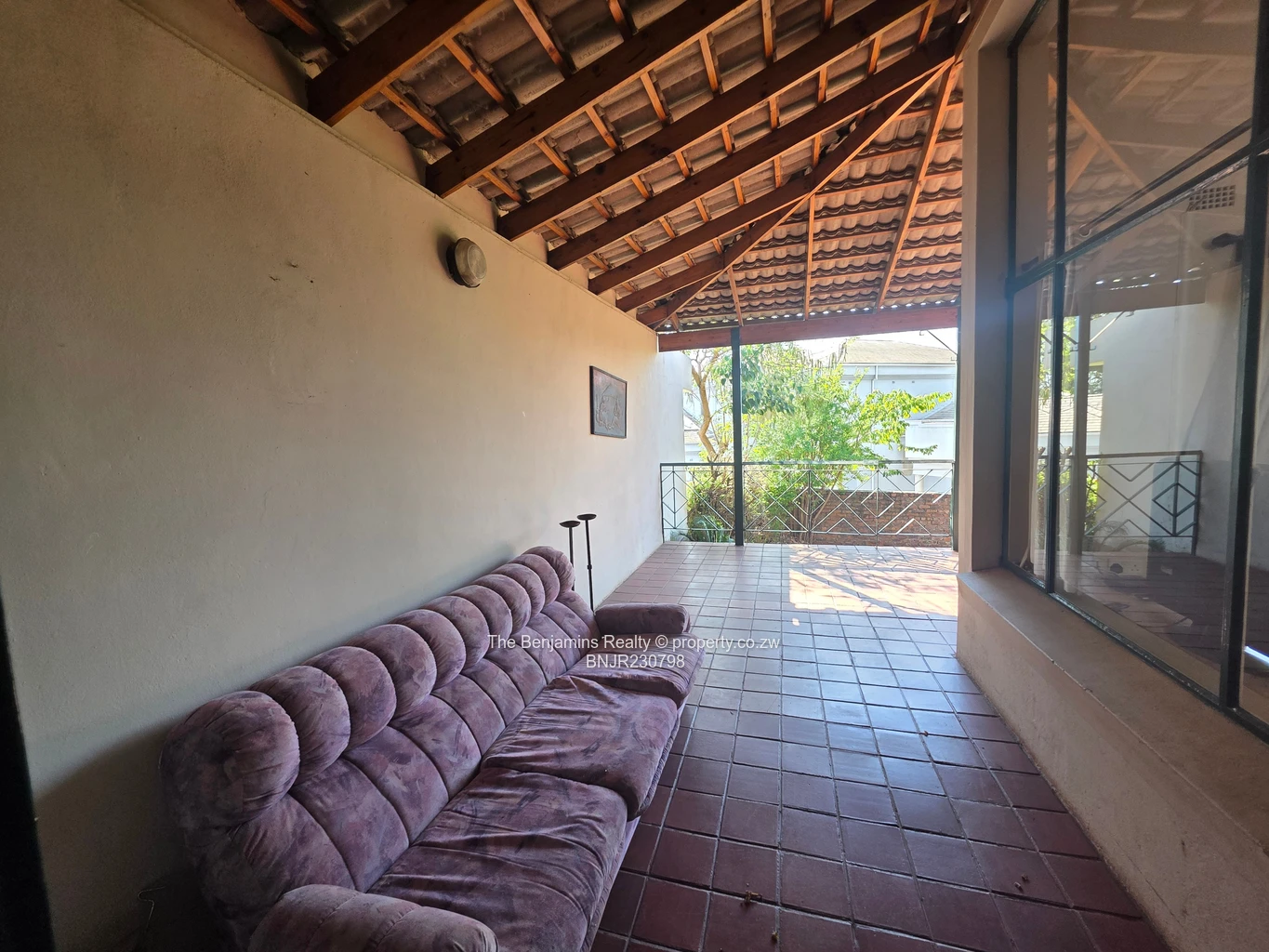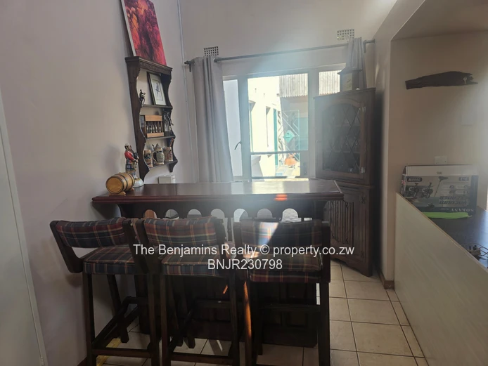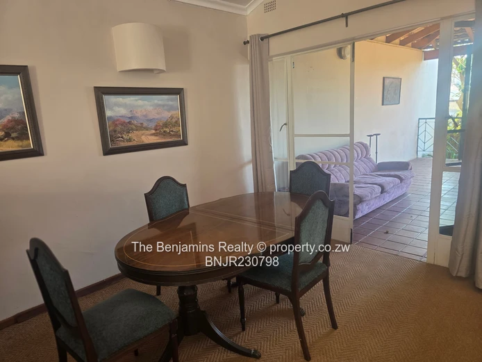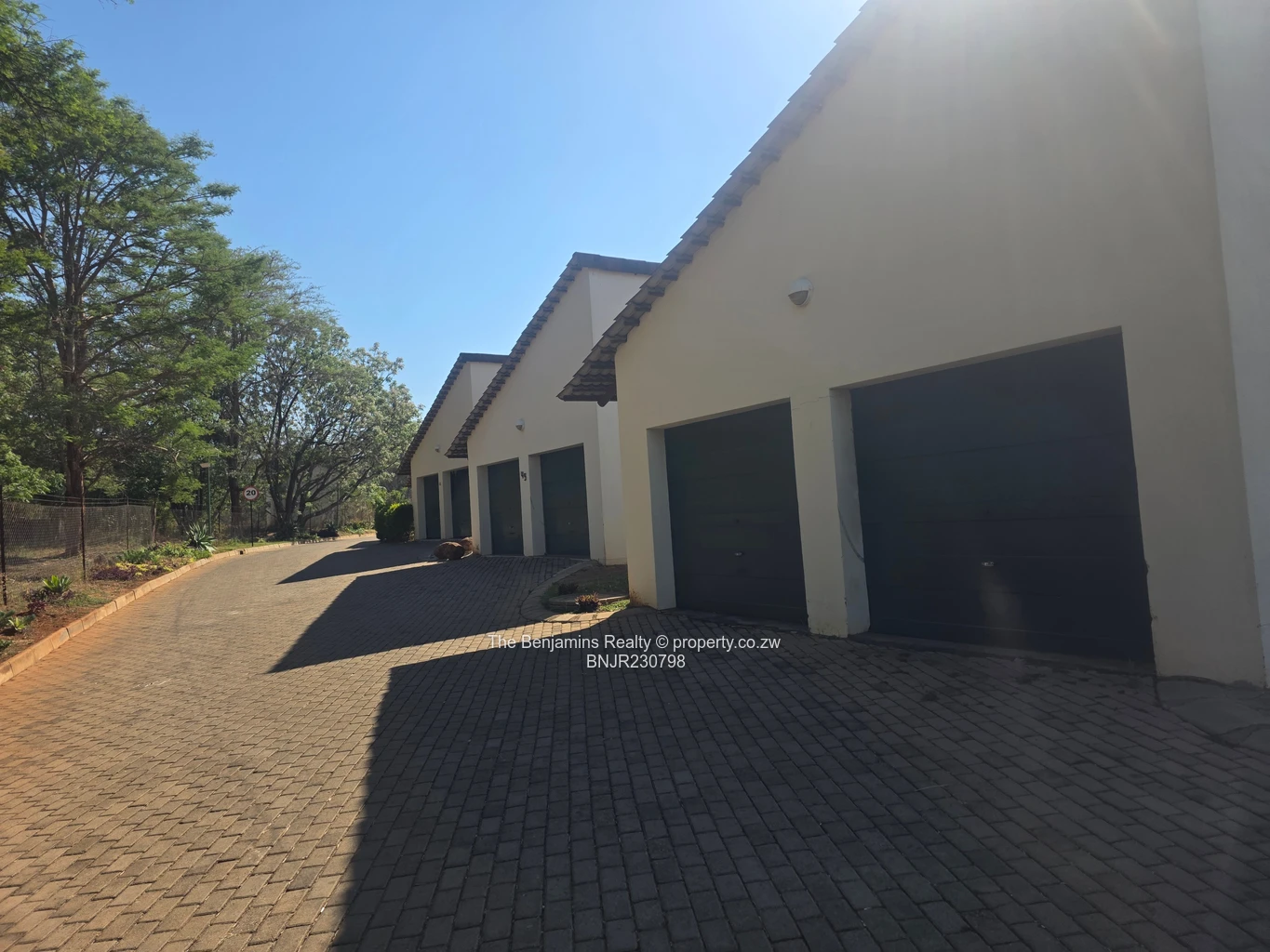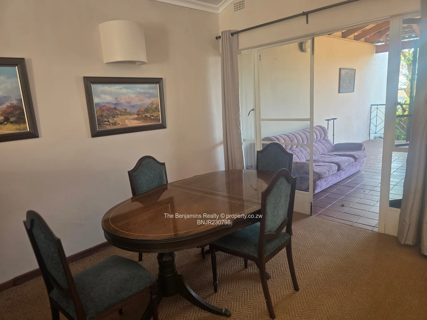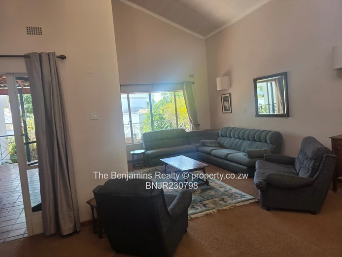 Rent yourself a life-style in the safe and secure golf estate at Borrowdale Brooke. Welcome to use the Club House. FURNISHED – a great lock up and go! Townhouse with three bedrooms. The main bedroom has a bathroom en suite, the second bedroom is serviced by the family bathroom. The third bedroom is outside attached to the house. Perfect as a Maid’s bedroom en suite or for guests. The kitchen flows is open plan into the dining room. The spacious lounge has a bar area. Doors open up onto a well sized undercover veranda. This area lends itself for easy entertaining. Outside the kitchen door is a courtyard. Lock up garage for two cars. Rental includes the levy. Security is simply fabulous. 24 hour guarded gate, electric fence. Borehole. The entire home is being re painted and tiled in the lounge area. Available immediately. No pets please