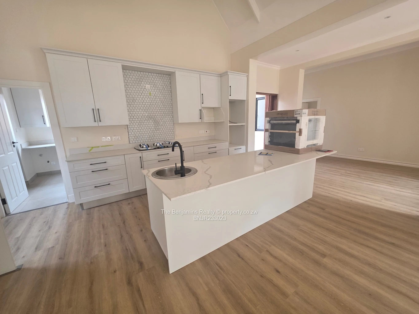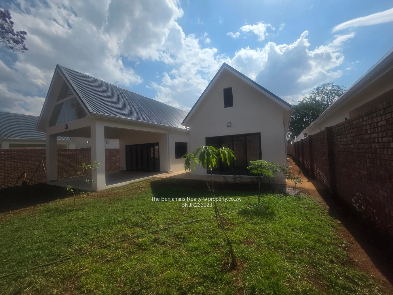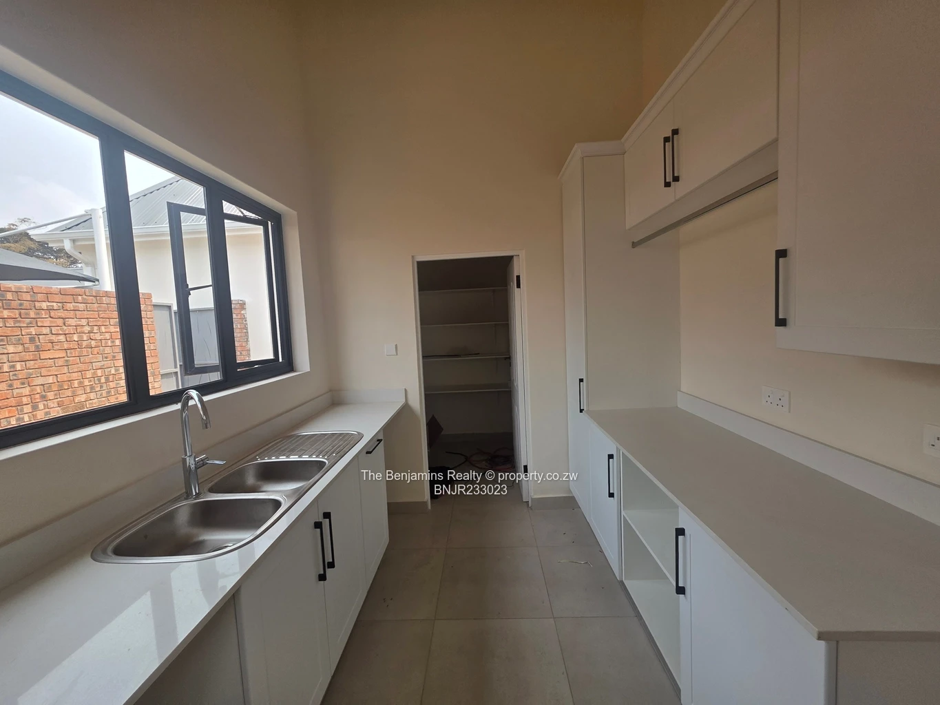 BRAND NEW TOP QUALITY TOWNHOUSE in prime location, close to Sam Levy's Village. This is an upmarket townhouse with excellent finishes. Three bedrooms, three bathrooms. Main bedroom has an en suite .French doors open onto the wonderful sized veranda. The family bathroom services the second bedroom and the third bedroom has an en suite and has a door opening onto a private garden area. A study nook. The kitchen/lounge/dining area is spacious with lots of natural light and high ceilings. The kitchen is fitted with top of the range units and has an oven and hob. Scullery and laundry are found behind the kitchen. There is a kitchen center table. The lounge doors open up onto a well sized undercover veranda which overlooks the pretty front garden. Good borehole. Back up tanks and a good colar system wired throughout the townhouse. Double shade port garage. Good security . Walled, electric gate, electric fence.